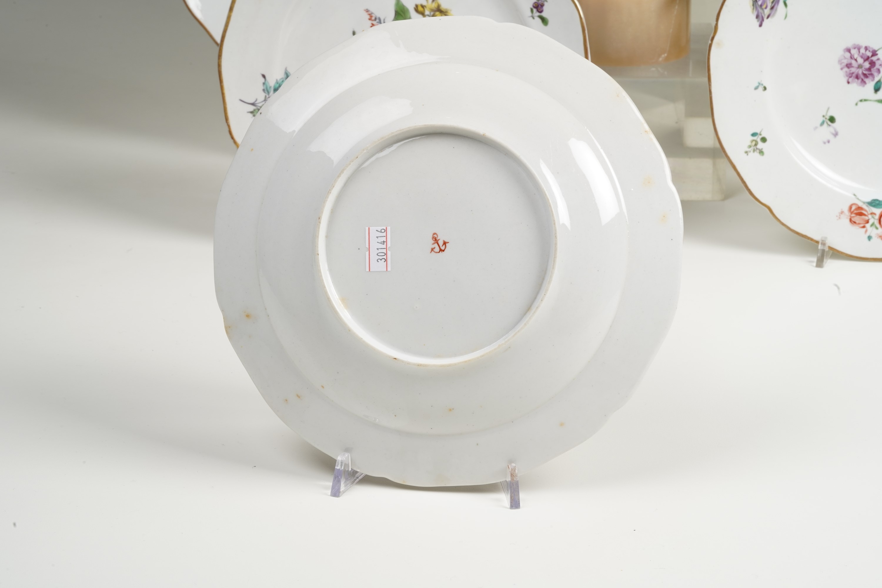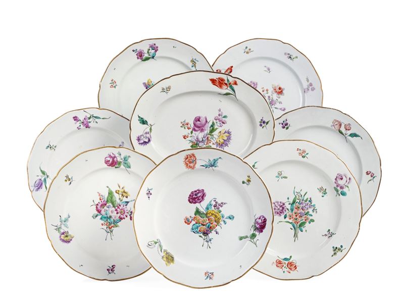 I piatti, dal bordo leggermente mosso, sono dipinti in policromia con un mazzolino di fiori europei nel cavetto e ramoscelli fioriti sparsi sulla tesa. Al bordo profilatura in oro. Questa tipologia di fiori è stata inventata da Meissen negli anni quaranta per poi essere stata ripresa da tutte le manifatture europee del vecchio continente