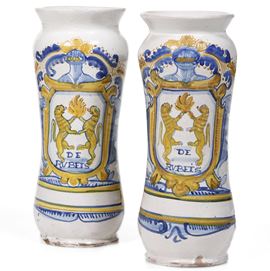 La coppia di albarelli dal fusto snello sono decorati con uno stemma araldico racchiuso in uno scudo dominato da un elmo piumato eseguito con mano rapida nello stile napoletano del Seicento: due leoni rampanti reggono una fiamma accompagnati dal nome della casata “De RUBEIS”
