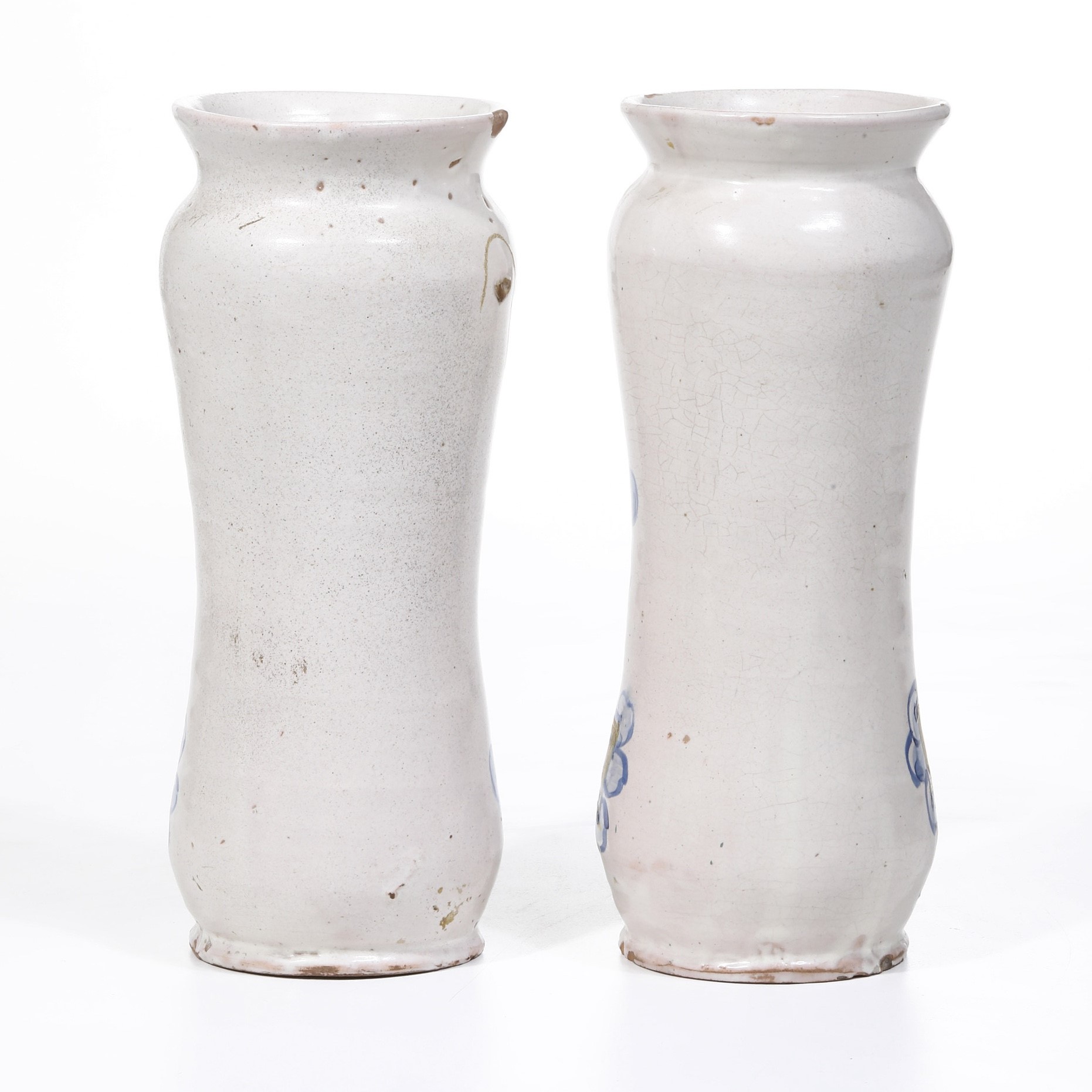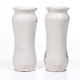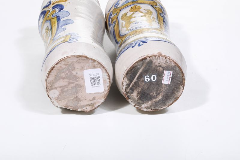 Maiolica. Altezza cm 27 circa. Conservazione: un albarello con insignificante felatura al bordo superiore; l’altro con piccola sbeccatura all’orlo superiore; minime sbeccature ai bordi