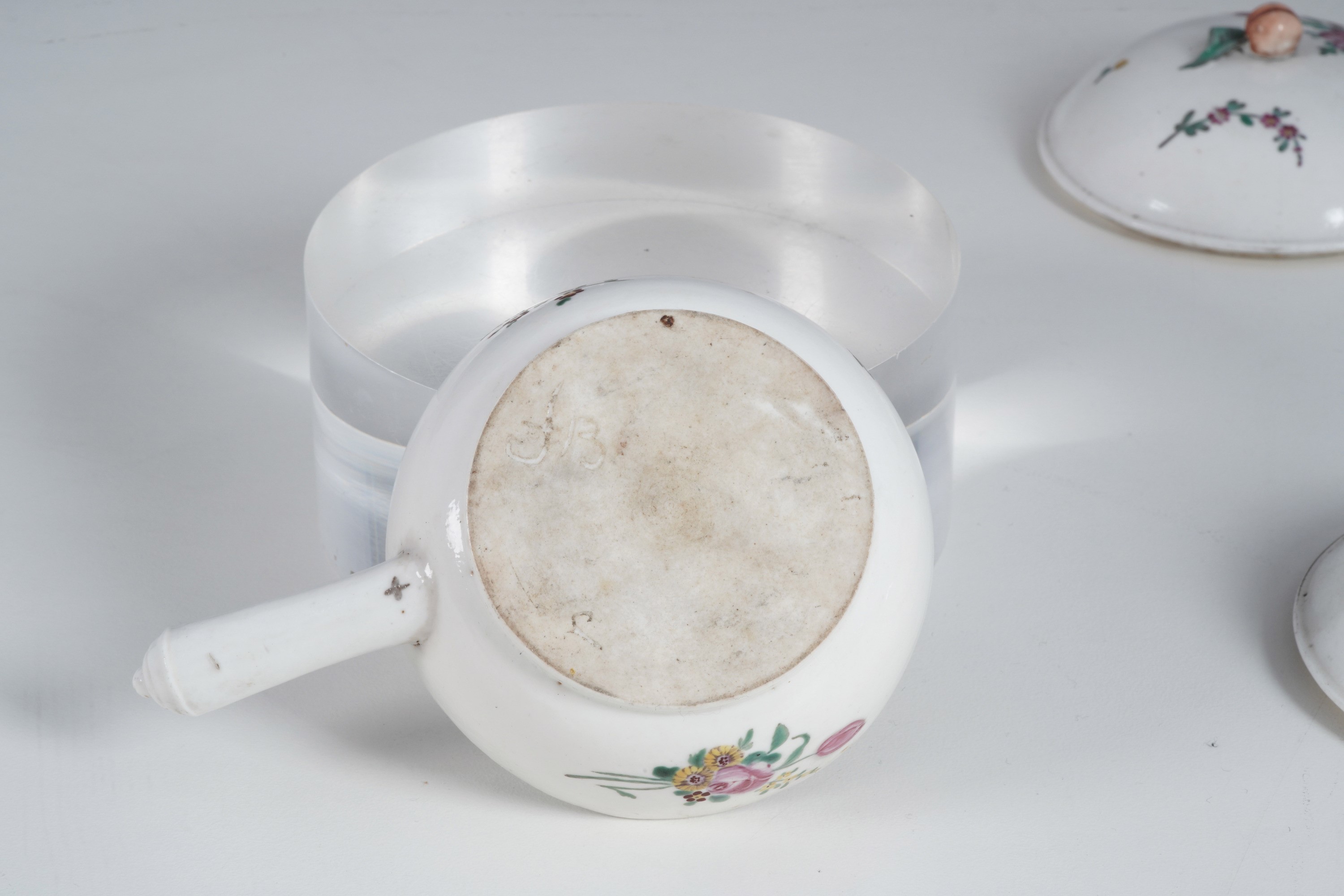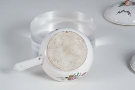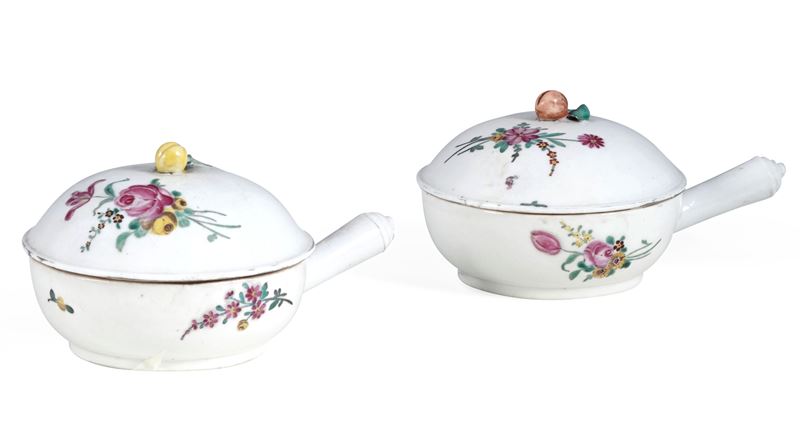 I nostri padellini, dalla presa del coperchio modellata a fruttino, presentano la particolarità d’avere il manico in porcellana che spesso era invece eseguito in legno. La decorazione vede steli di fiori recisi nei quali campeggia una rosa sapientemente dipinta in policromia