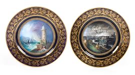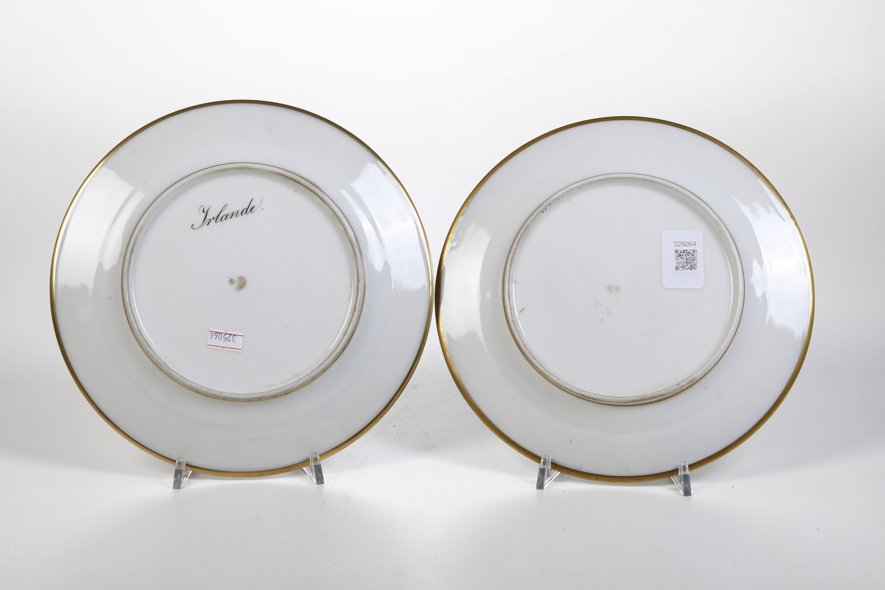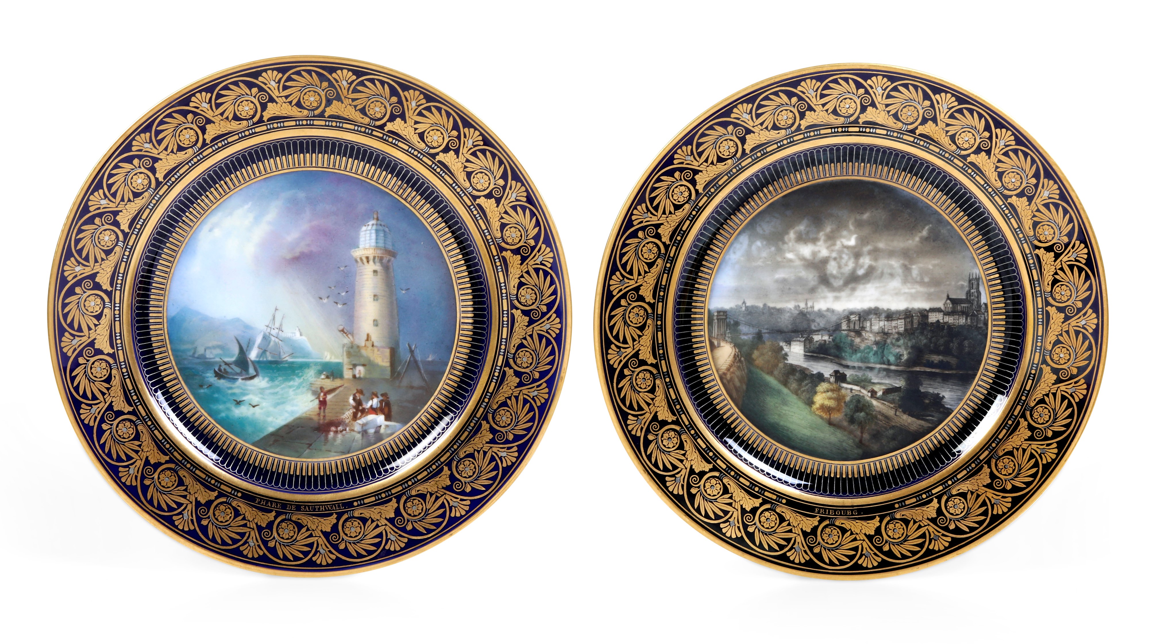 Questi piatti riprendono fedelmente il design del servizio “Vues pittoresques de l’Europe” eseguito a Sèvres tra il 1826 e il 1834 (vedi lotto precedente) di cui molti pezzi furono dono di Luigi Filippo a sua figlia Luisa, regina del Belgio