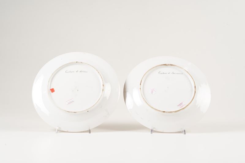 Le scene sono riprese dalle incisioni “Vestiture del Regno” eseguite dal 1784 per volere di Ferdinando IV. I disegni si devono a Giacomo Milani incisi poi su rame da Raffaele Aloja. La stessa scena del nostro piatto con i costumi di Rivisondoli la troviamo su un piatto conservato al Museo Correale di Sorrento, mentre quello con i costumi di Schiavi su una lattiera del servizio da caffè conservato a Napoli, Museo di Capodimonte, pubblicati da Angela Caròla-Perrotti, Le porcellane napoletane dell’Ottocento 1807-1860, Napoli 1990, fig. 237 e fig. 93. La stessa studiosa pubblica alla fig. 258 un piatto con la medesima tesa dei nostri
