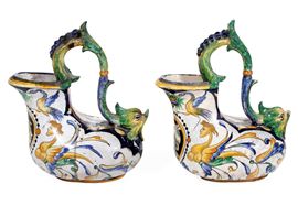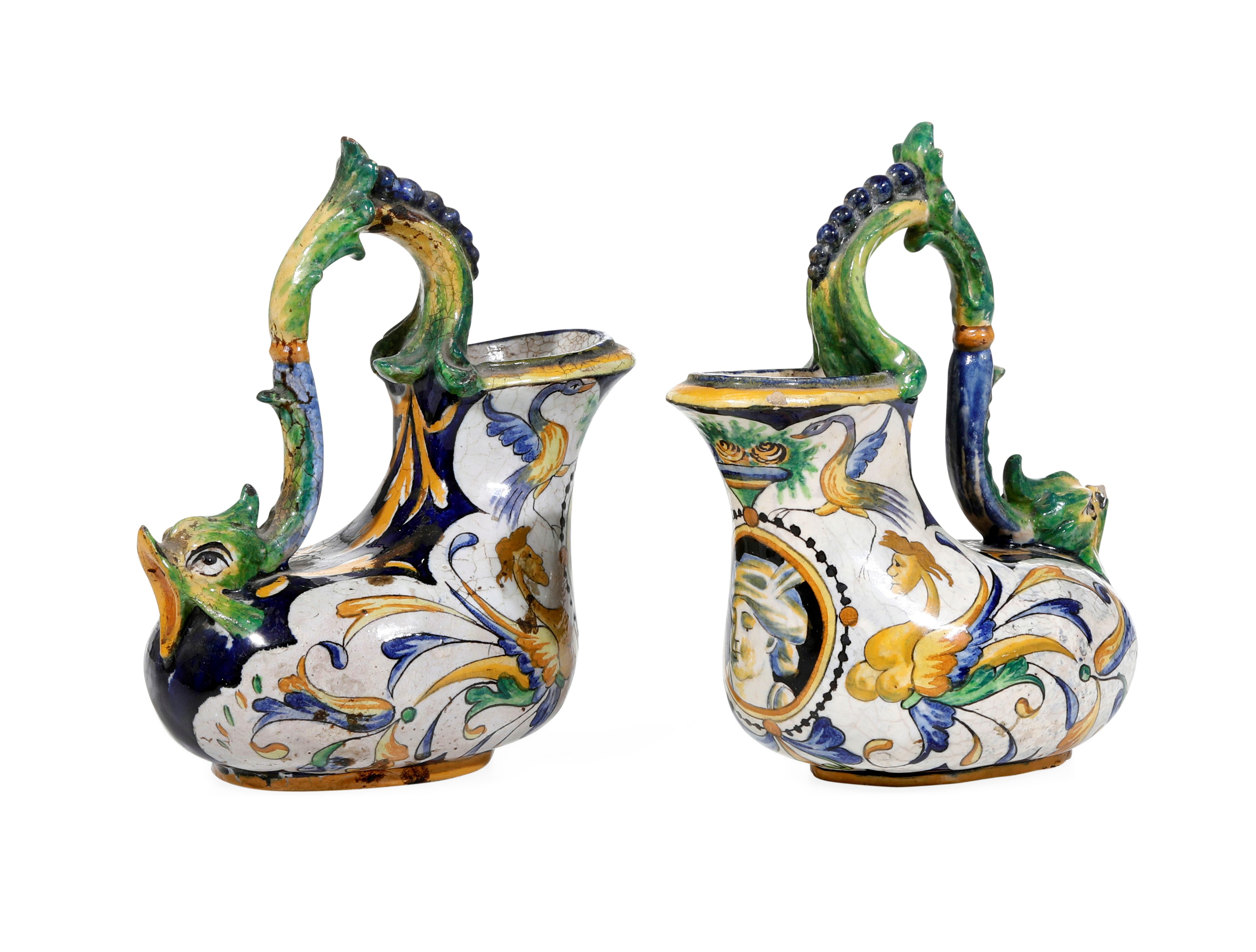I versatoi, dall’alto manico desinente a testa di grifone, sono decorati in policromia a raffaellesche e con un medaglione raffigurante un bustino su fondo nero alla maniera di Urbino del Cinquecento