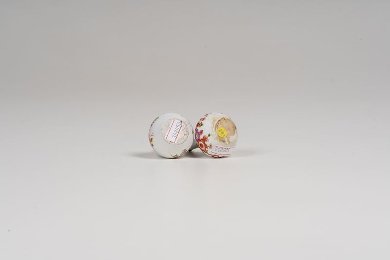 Porcellana. Marca: assente. Altezza cm 7. Conservazione: ottima; piccola sbeccatura al bordo inferiore di una bottiglietta.
