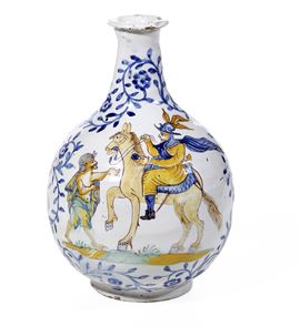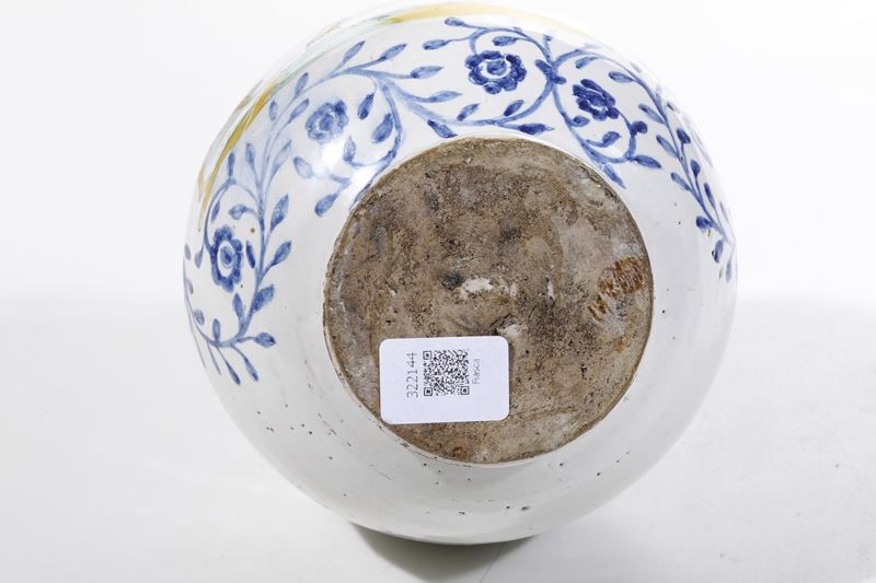 Maiolica. Altezza cm 26. Conservazione: ottima; insignificanti sbeccature al bordo inferiore e all’anello di base