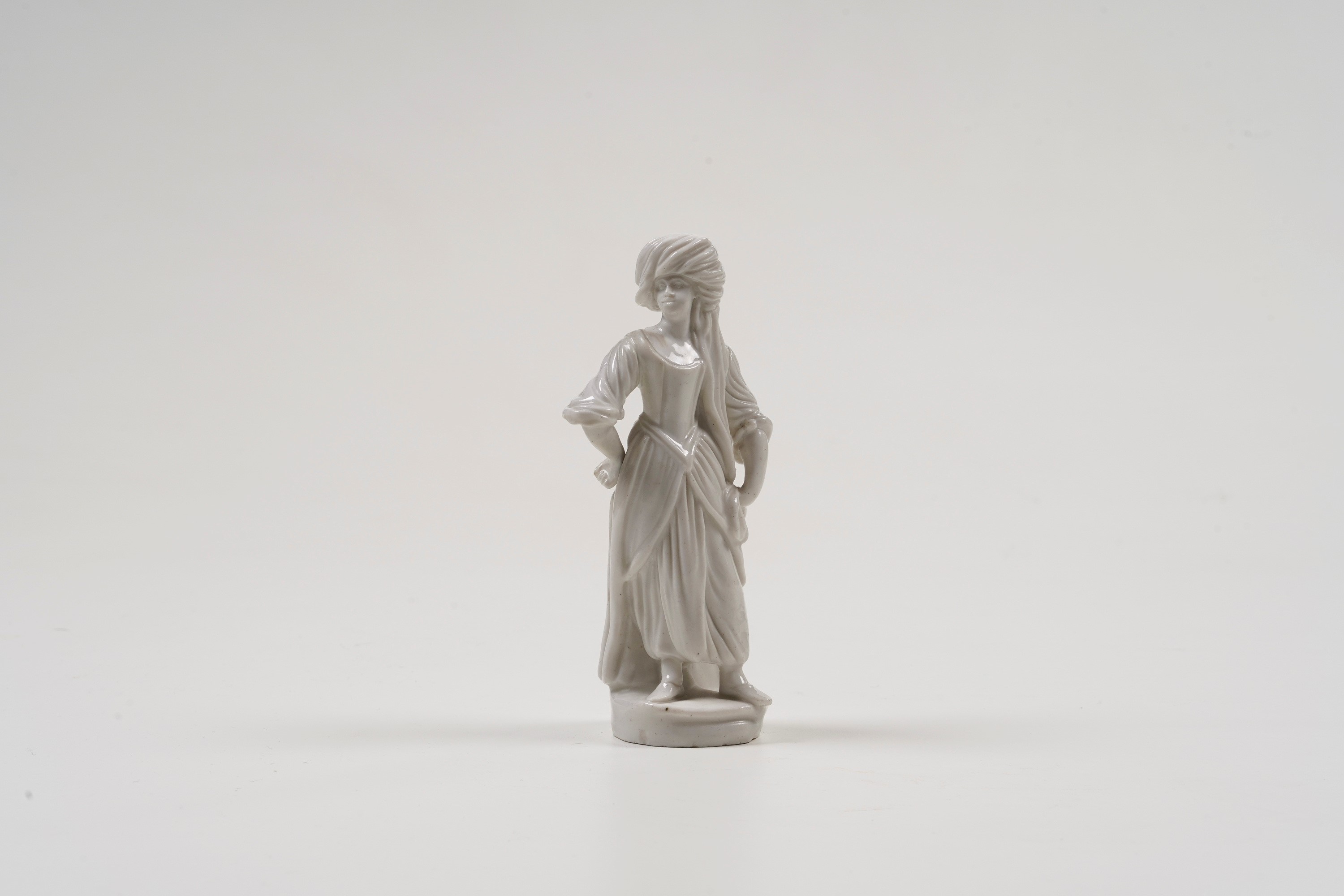 L’elegante sculturina raffigura una giovane donna abbigliata alla turca con un grande turbante da cui scende un lungo drappo. Sotto la gonna, aperta sul davanti, ampi pantaloni all’orientale