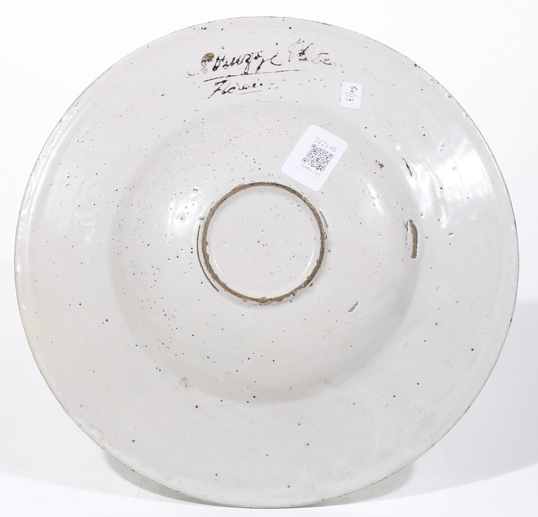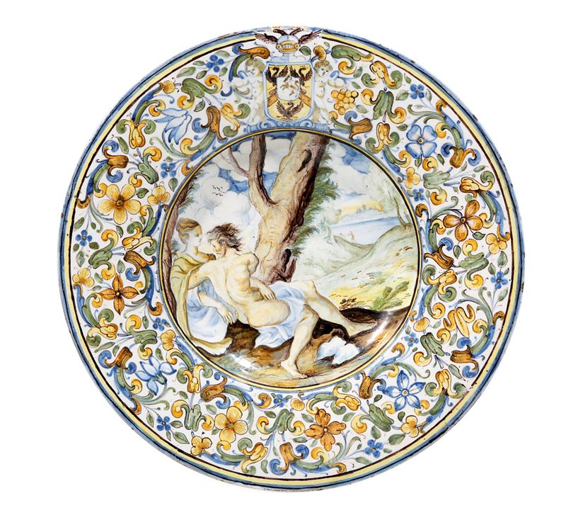 Maiolica. Diametro cm 29,2. Conservazione: buona; sbeccatura con felatura alle ore 5 restaurata; tracce di lumeggiatura in oro