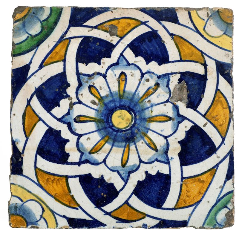 Laggione da rivestimento parietale o pavimentale, decorato con intrecci di nastri circolari intersecantesi e corolle stilizzate nei colori blu, ocra, giallo e verde di ispirazione ispano moresca