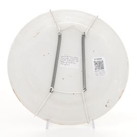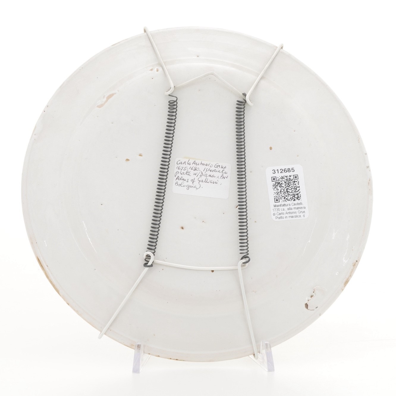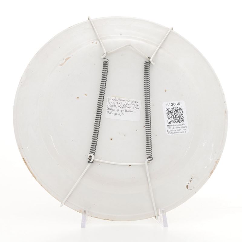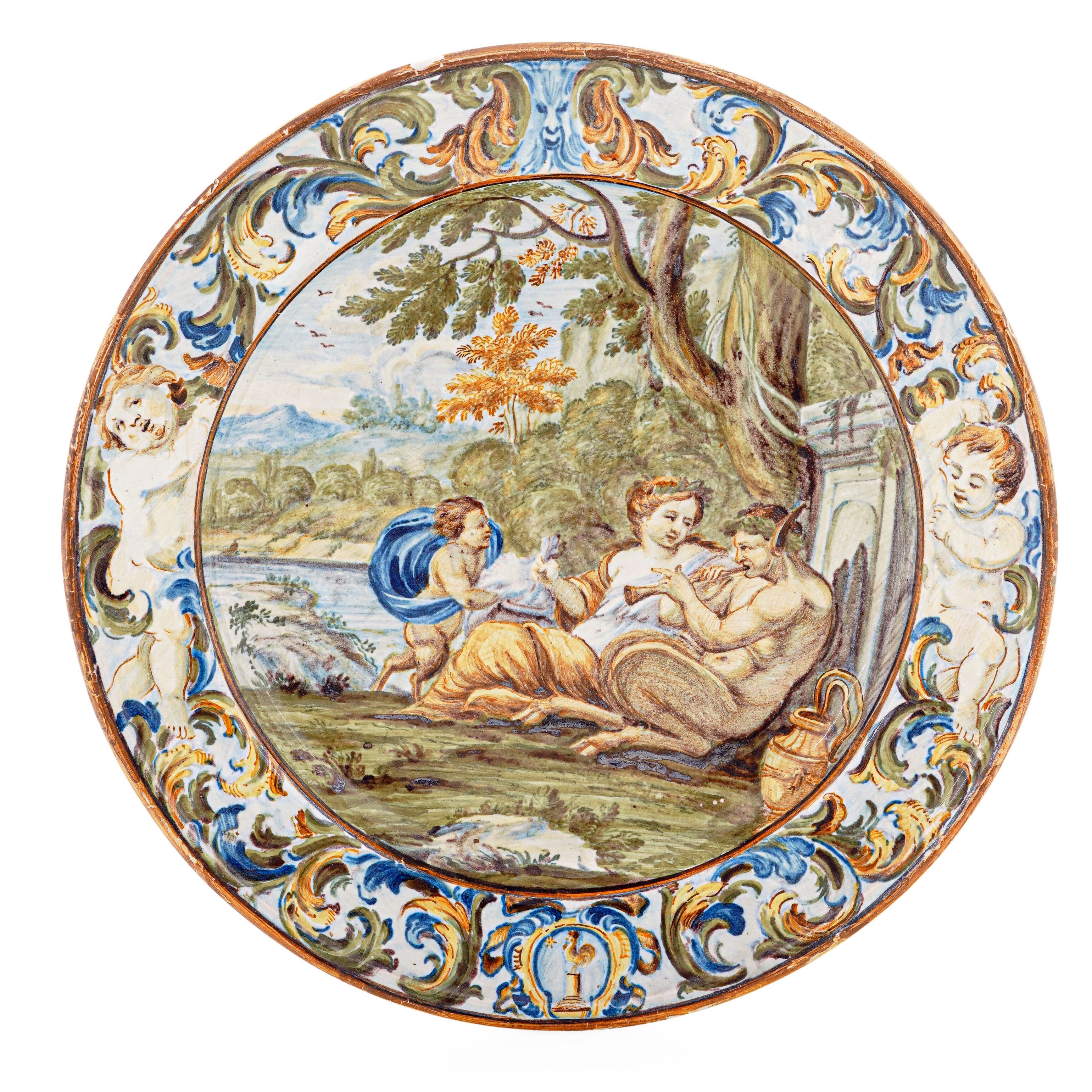 Piatto tondo in maiolica fina, decorata con colori a gran fuoco. La tesa presenta un ornato a girali fogliate, su fondo azzurro, animate da due putti, con uno stemma con gallo su tronco di colonna e una stella. Il fondo ospita una scena antica all’aperto: un satiro suona il flauto ascoltato da una ninfa e un satirello. Questo piatto è anche un raro esempio della procedura pittorica di Carlo Antonio Grue: le zampe del satiro mostrano che la stesura è incompiuta, mancano gli ultimi passaggi di bruno e nero nel profilare e chiaroscurare le figure. (Per confronti stilistici vedi ad esempio L.Arbace, Carlo Antonio Grue, Colledara (TE) 2002, p. 119, n. 82)