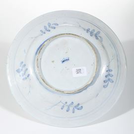 La decorazione monocroma azzurra, eseguita sul fondo bianco a sfumatura molto lieve del medesimo colore, propone gli elementi vegetali e le minime figure di insetti propri della tipologia calligrafica orientaleggiante a tappezzeria, disposti rarefatti gli uni e dispersi gli altri lungo la tesa, l’ingiro e sul cavetto.