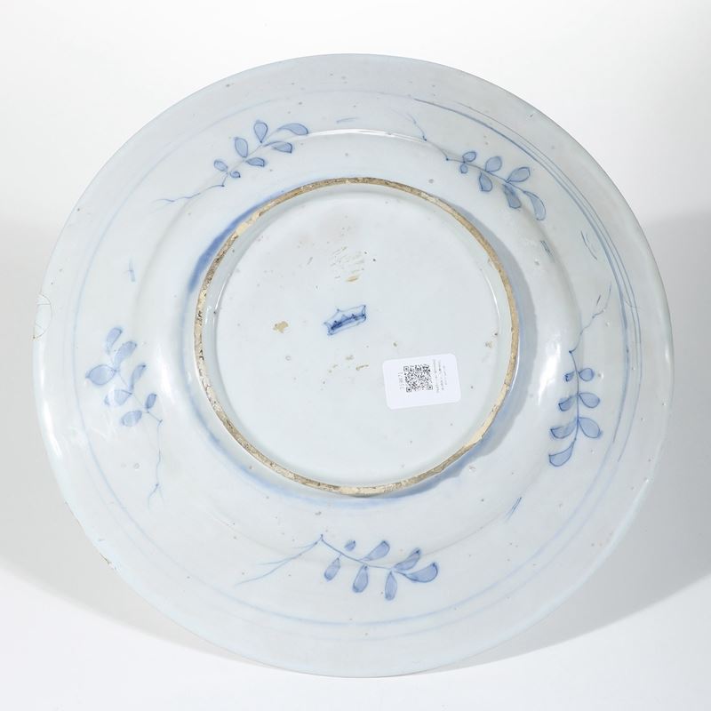 La superficie posteriore del piatto appare ornata dalla presenza di cinque ramoscelli di colore azzurro disposti al confine fra l’ingiro e la tesa, all’interno della fascia circoscritta da due linee continue azzurre, una tracciata a metà della tesa l’altra vicino al piede.