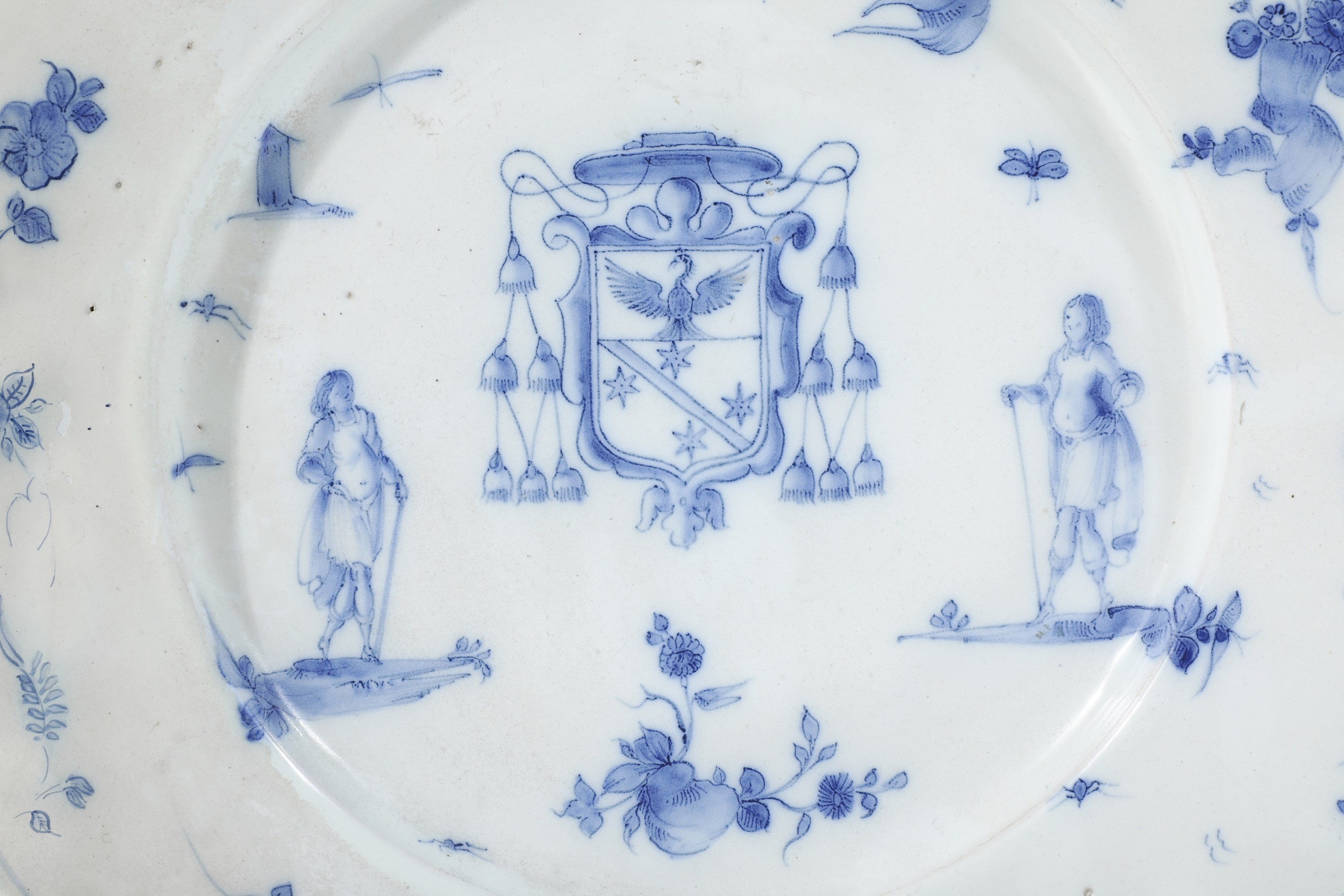 L’insegna araldica ecclesiastica dipinta al centro del cavetto dichiara il possesso di una dignità religiosa di grado non facile da definire: assente la croce “in palo” distintiva di quella vescovile, né la foggia del galero né i sei fiocchi laterali bastano a qualificarla tale; l’anomalia suggerisce l’incarico del governo pastorale di un territorio come “prelatus nullius diocesis”, vale a dire senza l’ordinazione episcopale, da semplice sacerdote. A ciascun lato dello scudo si trova una figurina maschile in posa eretta abbigliata vagamente all’antica, volta in segno di omaggio verso l’insegna, che illustra un’ascendenza nobiliare probabilmente estranea alla Liguria; la terza figurina, di aspetto identico alle altre, siede all’interno del frammento di paesaggio esotico situato presso il colmo inferiore della tesa.