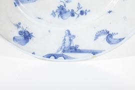 Maiolica. Marca: corona. Diametro cm 34,7. Conservazione: rottura alla tesa tra le ore 7 e le ore 11 ripresa in vecchio restauro