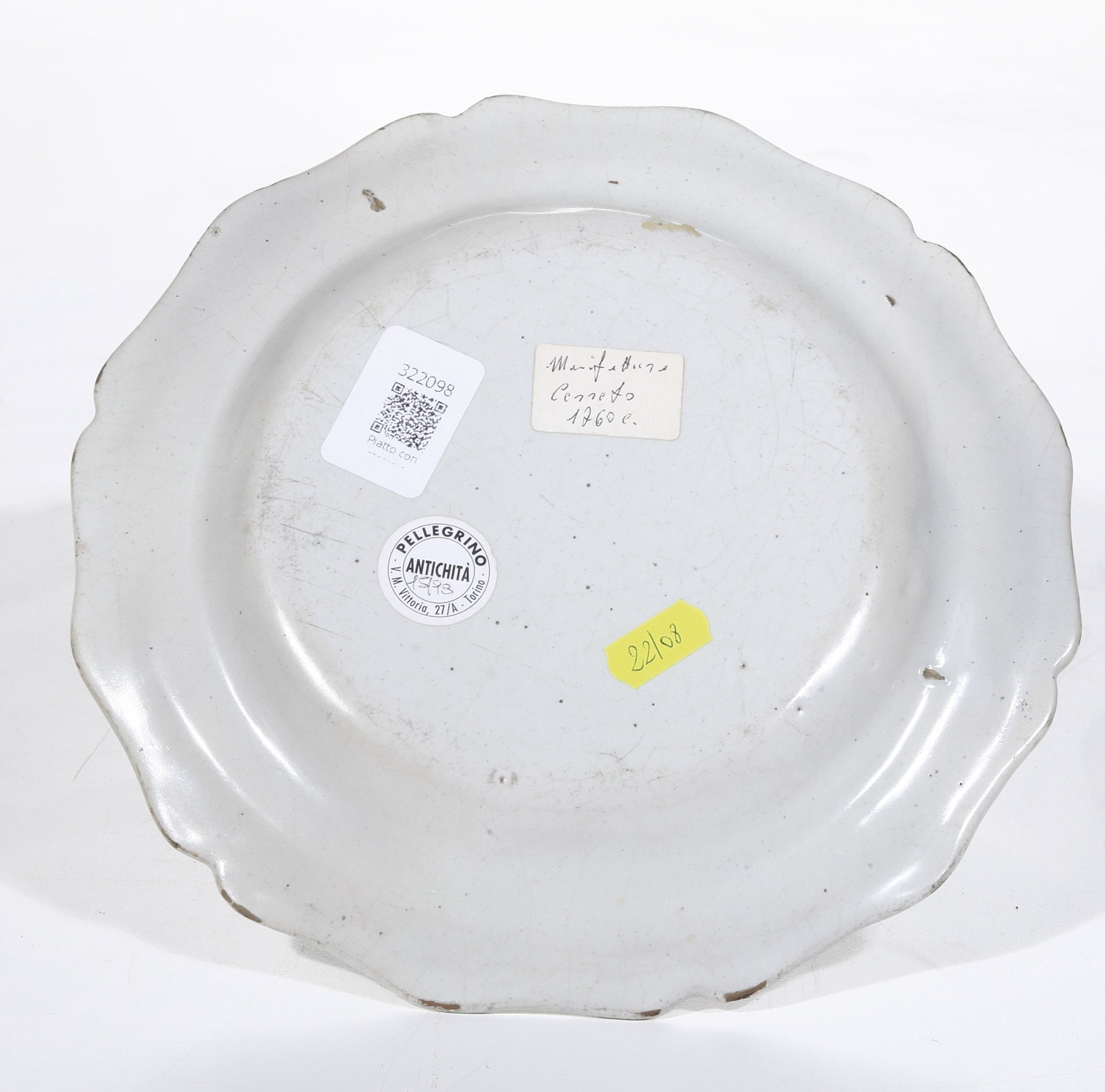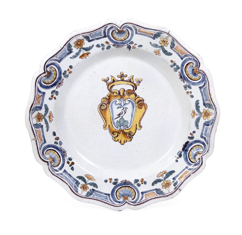 Il piatto dal profilo mistilineo è decorato in policromia a gran fuoco con un grande stemma nobiliare nel cavetto e, sulla tesa, con un motivo a conchiglie alternate a riserve con graticcio, inoltre steli fioriti