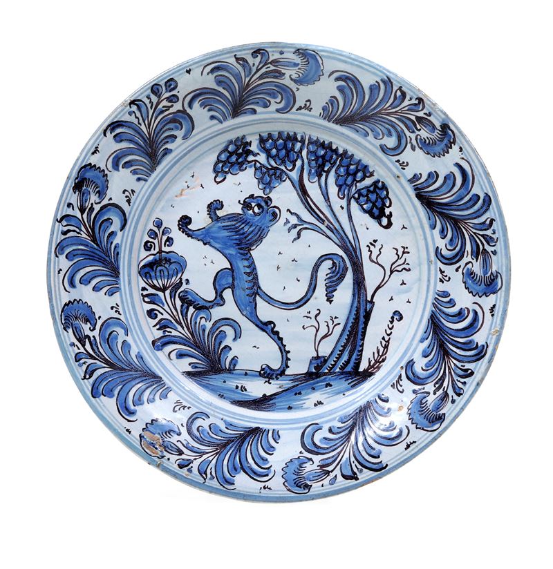 Il piatto è decorato, in monocromia turchina su fondo berettino, nel cavetto con un leone rampante tra vegetazione, incorniciato da steli fogliati con garofano che si susseguono simmetricamente sulla tesa