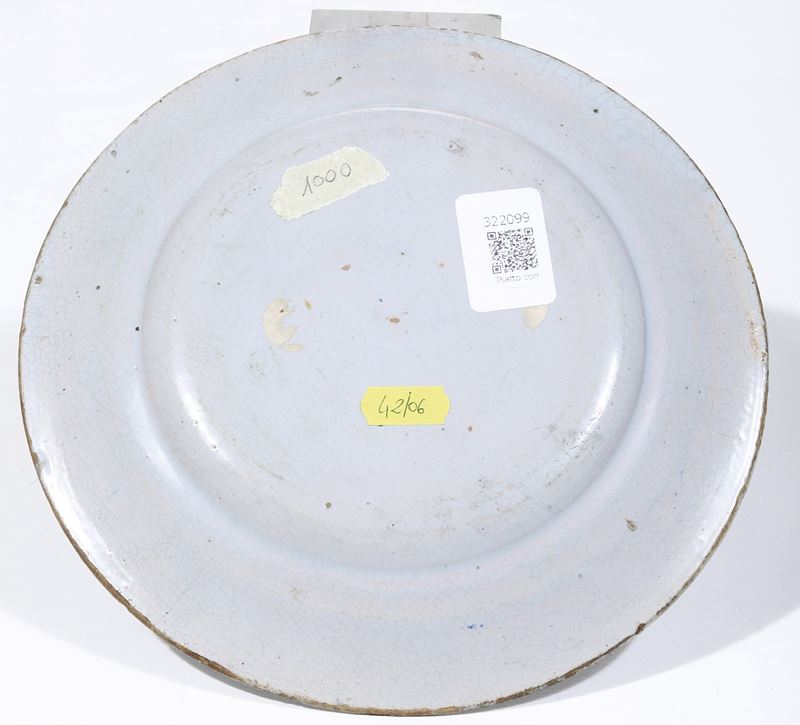 Maiolica. Diametro cm 22,2. Conservazione: ottima; piccola sbeccatura ricomposta in restauro tra le ore 12-13