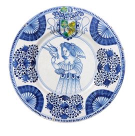 Piatto, decorato in turchino, dalla tesa a ventagli con motivi vegetali e stemma bipartito dipinto in policromia con albero e leone rampante. Nel cavetto figura muliebre in abiti seicenteschi che si rifà all’ornato tipico del repertorio di A.A. d’Alessandro