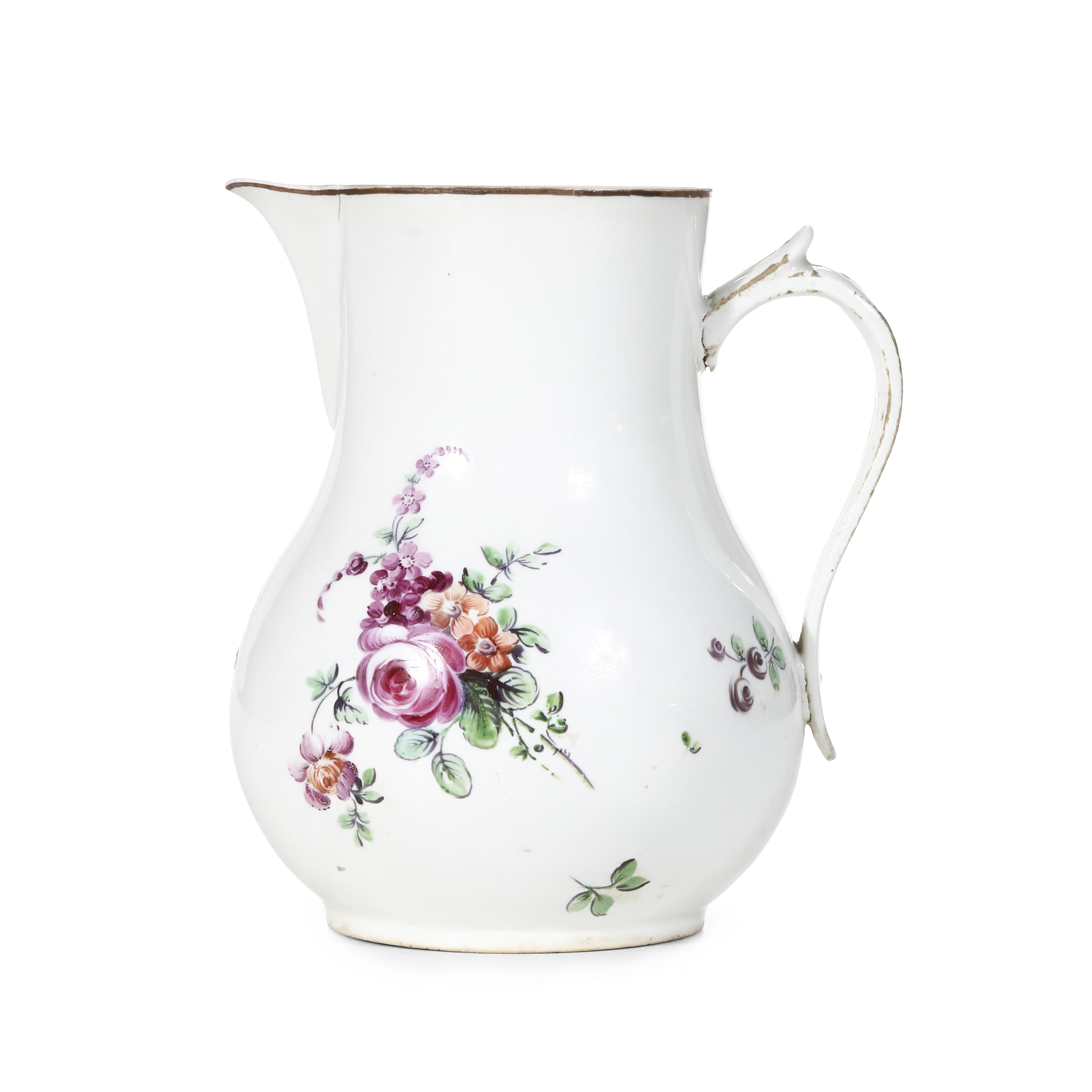 Caffettiera piriforme con manico sormontato da un beccuccio e decorazione policroma con mazzetti di fiori europei e ramoscelli fioriti