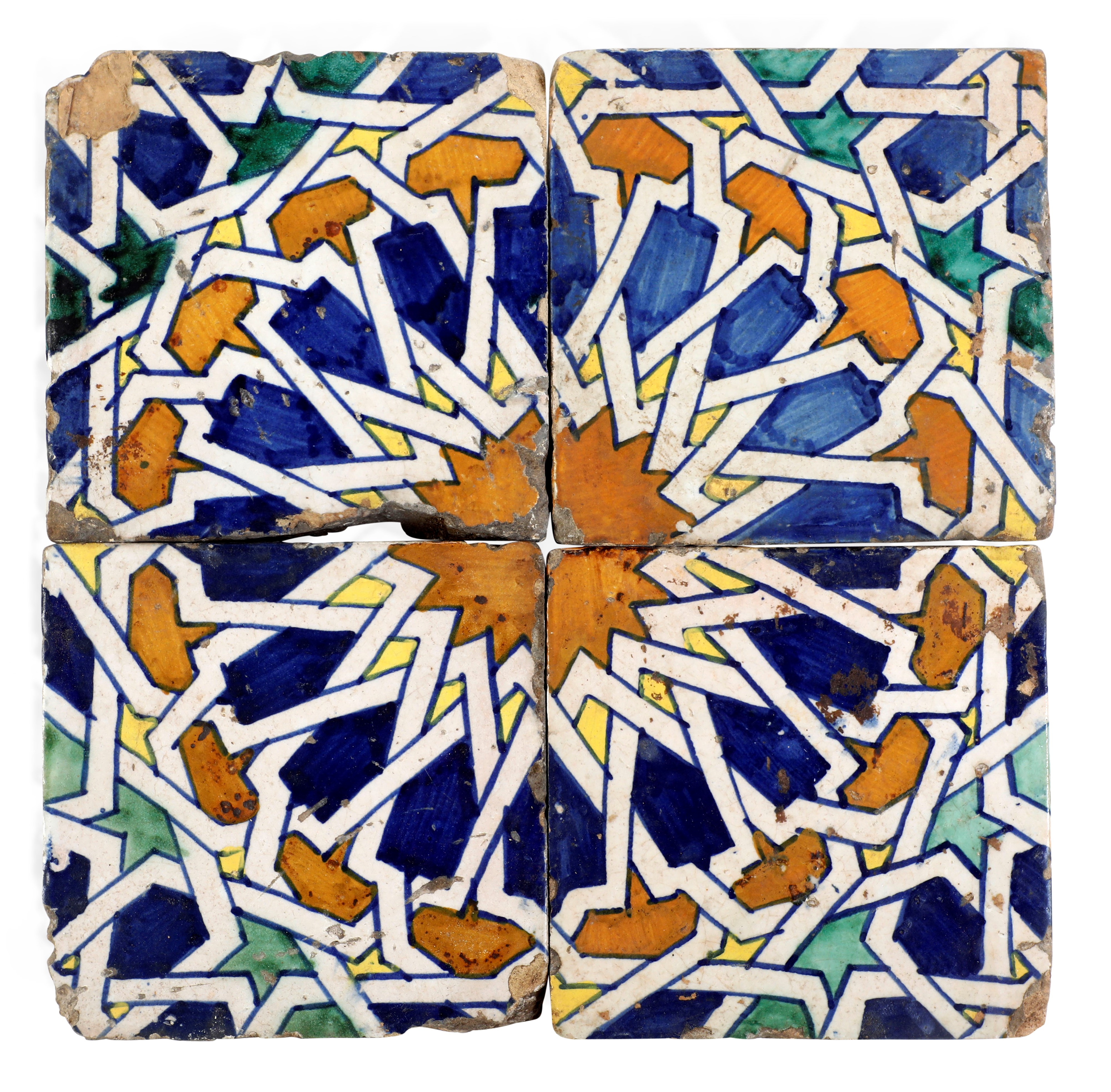 Maiolica. Dimensioni: piastrella cm 14,3x14,3; misura totale cm 28,6x28,6 circa. Conservazione: qualche sbeccatura e salti di smalto