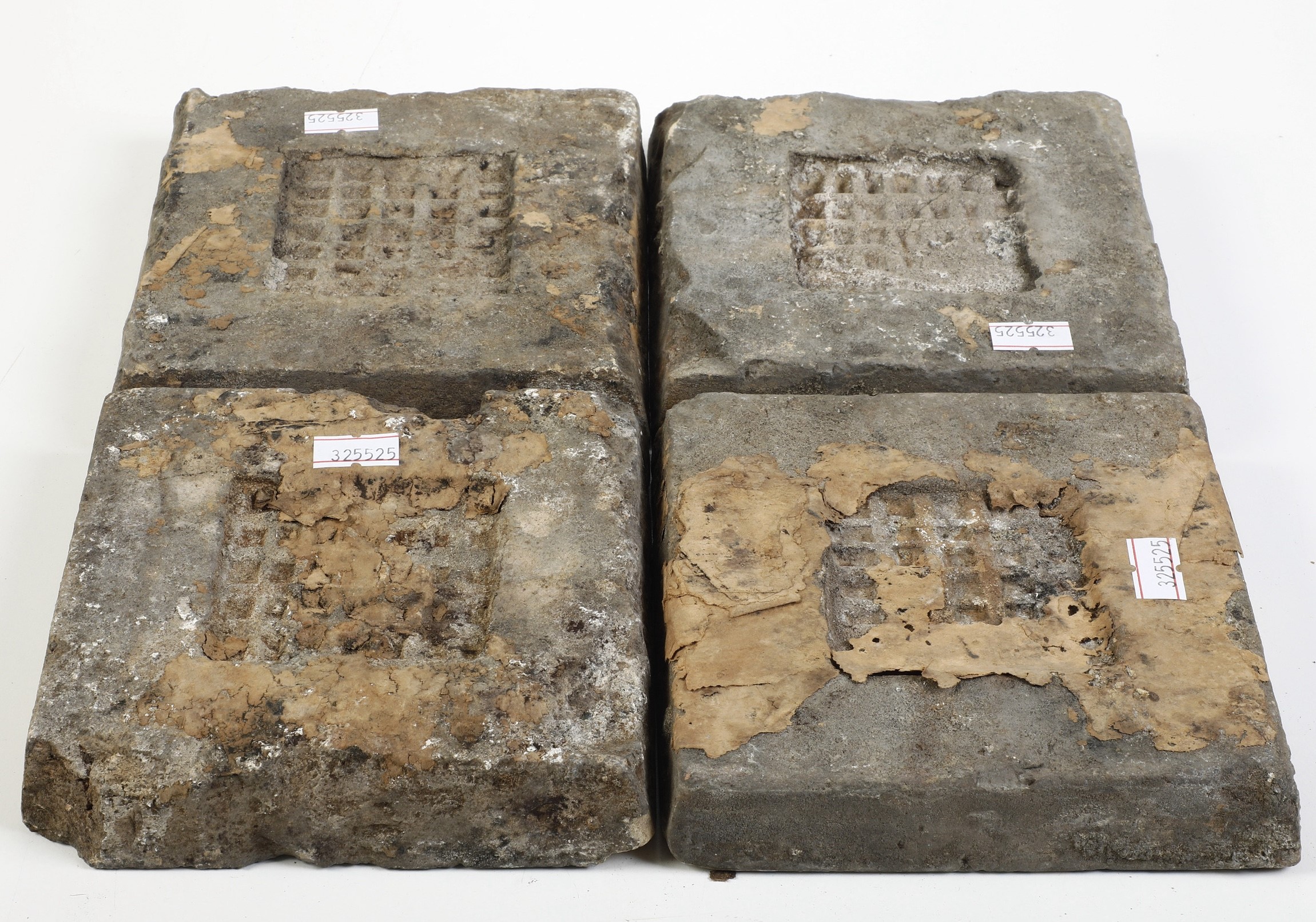 Questi laggioni quadrati sono decorati “a cellula dipendente” o “a tappeto” in quanto il disegno si completa con l’accostamento di alcune piastrelle. Il motivo è ripreso dagli “azulejos” ispano-islamici di Toledo del XV secolo che importati in Liguria vennero imitati dai ceramisti savonesi che a differenza dagli spagnoli non utilizzavano la tecnica della “cuerda seca” ma quella della maiolica per cui la superficie risulta liscia