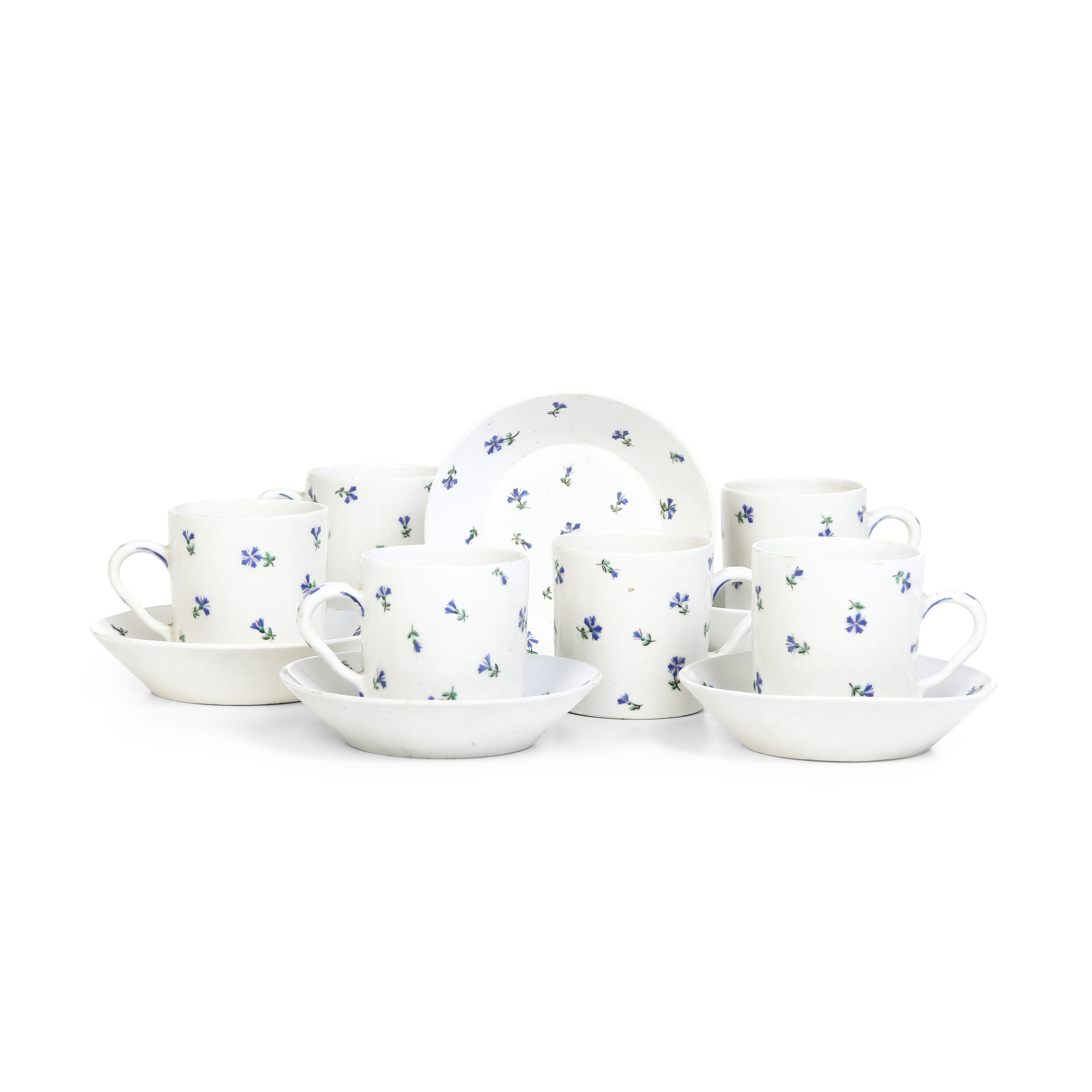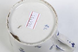 Tazze cilindriche dal manico ad orecchio con piattino troncoconico, decorate con rametti di fiordalisi sparsi molto in voga all’epoca in particolare sulle porcellane francesi e usato spesso a Vinovo