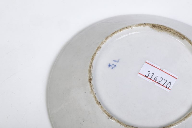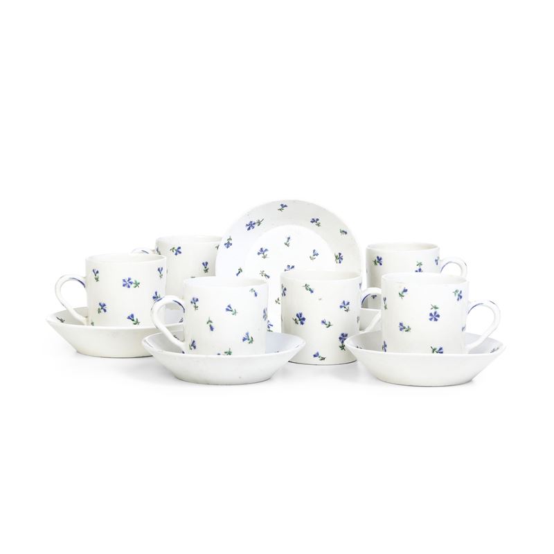 Porcellana. Marca: “V” con “+” e lettera “L” in blu; sotto alcune tazze “V” con “+” inciso. Dimensioni: altezza tazza cm 6,4; diametro piattino cm 11,7. Conservazione: ottima; una tazza con piccola felatura al bordo superiore in prossimità del manico