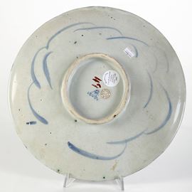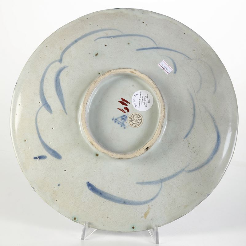 Maiolica. Marca: Stemma di Savona. Dimensioni: altezza cm 4,5; diametro cm 32. Conservazione: sbeccature intorno al bordo; un piccolo restauro alle ore 11