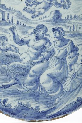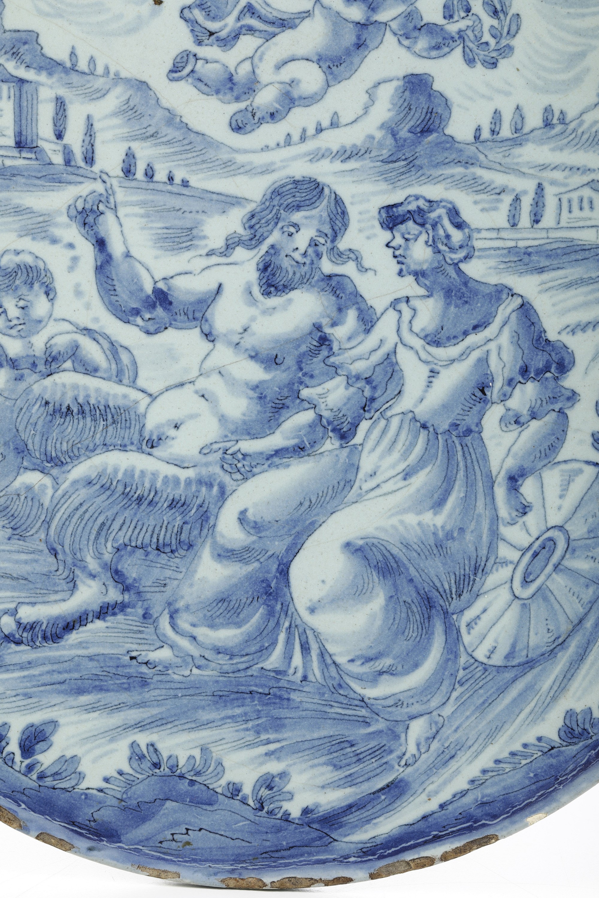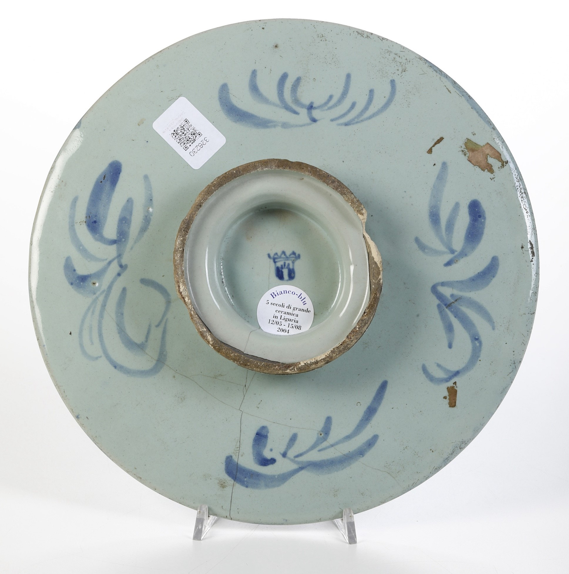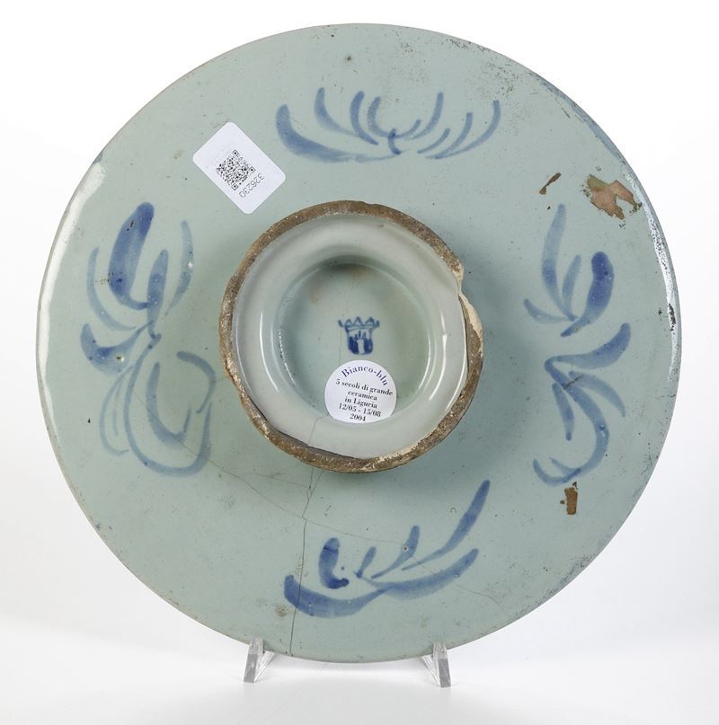 Maiolica. Marca: Stemma di Savona. Dimensioni: altezza cm 4,5; diametro cm 29. Conservazione: sbeccature al piede e piccole al bordo; insignificanti felature