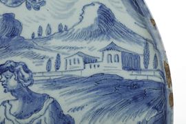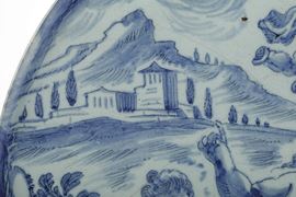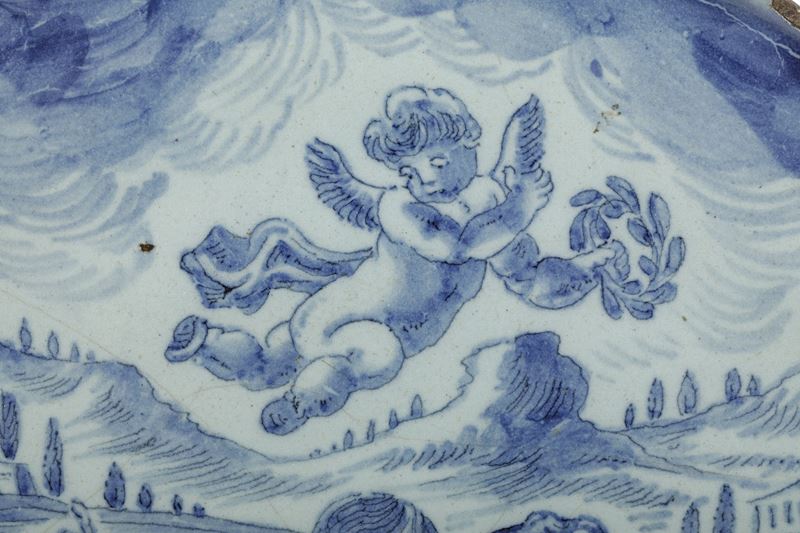 La decorazione istoriata occupa l’intera superficie del piano di posa, eseguita in monocromia blu sul fondo azzurro a tenue sfumatura di verde, concepita servendosi dei principi estetici non codificati della “scenografia barocca”, il neologismo classificatorio indispensabile per distinguere una fase dell’istoriato ligure (2).