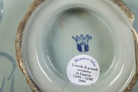 La marca Stemma di Savona, di colore blu, tracciata al centro della superficie, risulta circoscritta dalla parte superiore del piede; la sua presenza certifica la produzione savonese della maiolica, nell’ultimo quarto del XVII secolo.