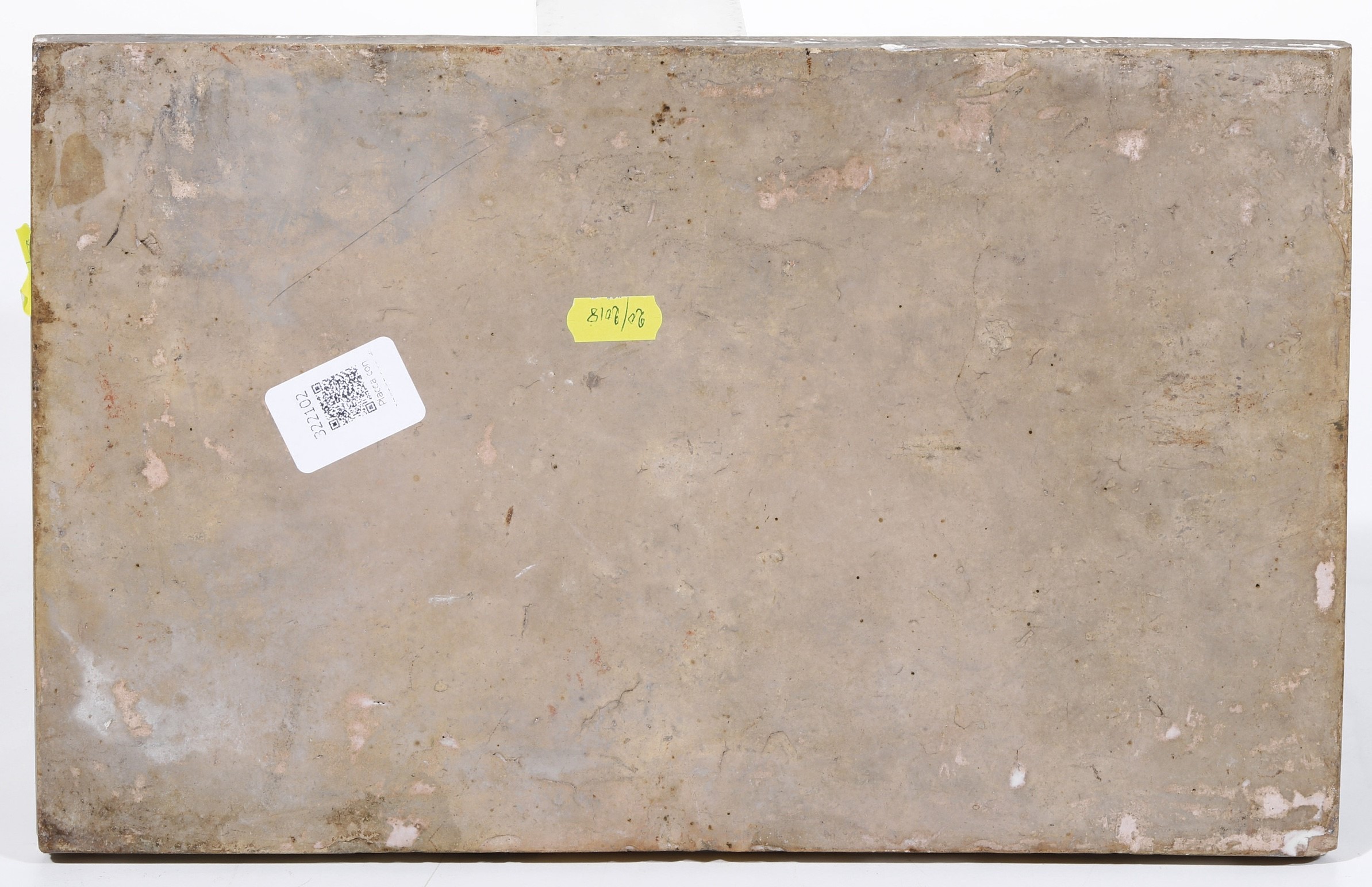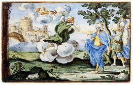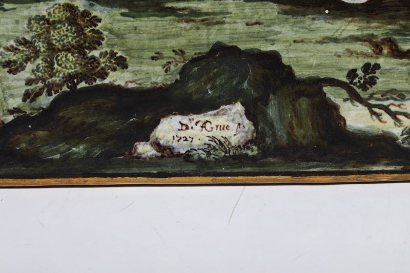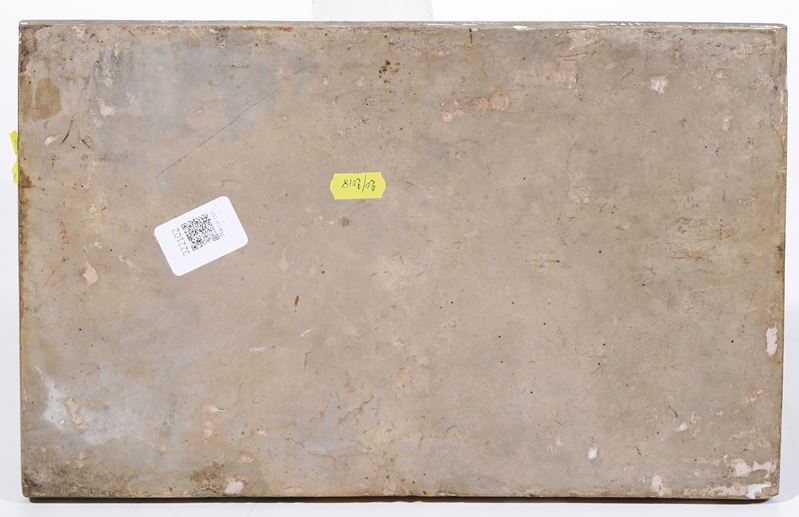 Interessante targa rettangolare che raffigura una scena dell’Eneide: Mercurio sollecita Enea ad andare a Cartagine. Nell’iscrizione, in basso a destra, si legge infatti “P.V. AEneid L.IV” e a sinistra “Dr.F.Grue p.”, sigla del celebre pittore castellano Francesco Antonio Saverio Grue, accanto alla data “1727”. Come dimostra anche in quest’opera il pittore, è degno erede della cultura artistica del padre Carlo Antonio. Fine interprete dell’istoriato castellano, dagli anni venti è attivo a Napoli con successo. In un albarello, datato 1735, oggi conservato al Museo della Certosa di San Martino a Napoli, riconosciamo grande somiglianza nella descrizione pittorica della città sullo sfondo, con un edificio simile al Castel Sant’Angelo romano. (cfr. T. Fittipaldi, Museo di San Martino, Ceramiche. Castelli, Napoli, altre fabbriche, Napoli 1992, pp. 42-43, n. 57; L.Arbace, Francesco Antonio Saverio Grue, Napoli 2005, p. 159)