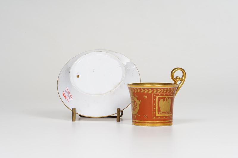 La tazza cilindrica - leggermente estroflessa verso l’alto dal manico a volute - ed il piattino troncoconico sono decorati in oro su fondo rosso. Al centro troviamo un motivo a trofei con corona, faretra e freccia, attorniato da riserve con un cigno. Inoltre ghirlande di steli fogliati e fioriti