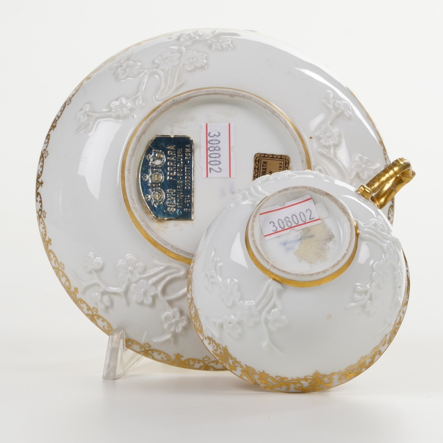 La tazza ed il piattino sono decorati sulla superficie esterna con ramoscelli fioriti di pruno eseguiti a rilievo. Il manico della tazza è a “J”.