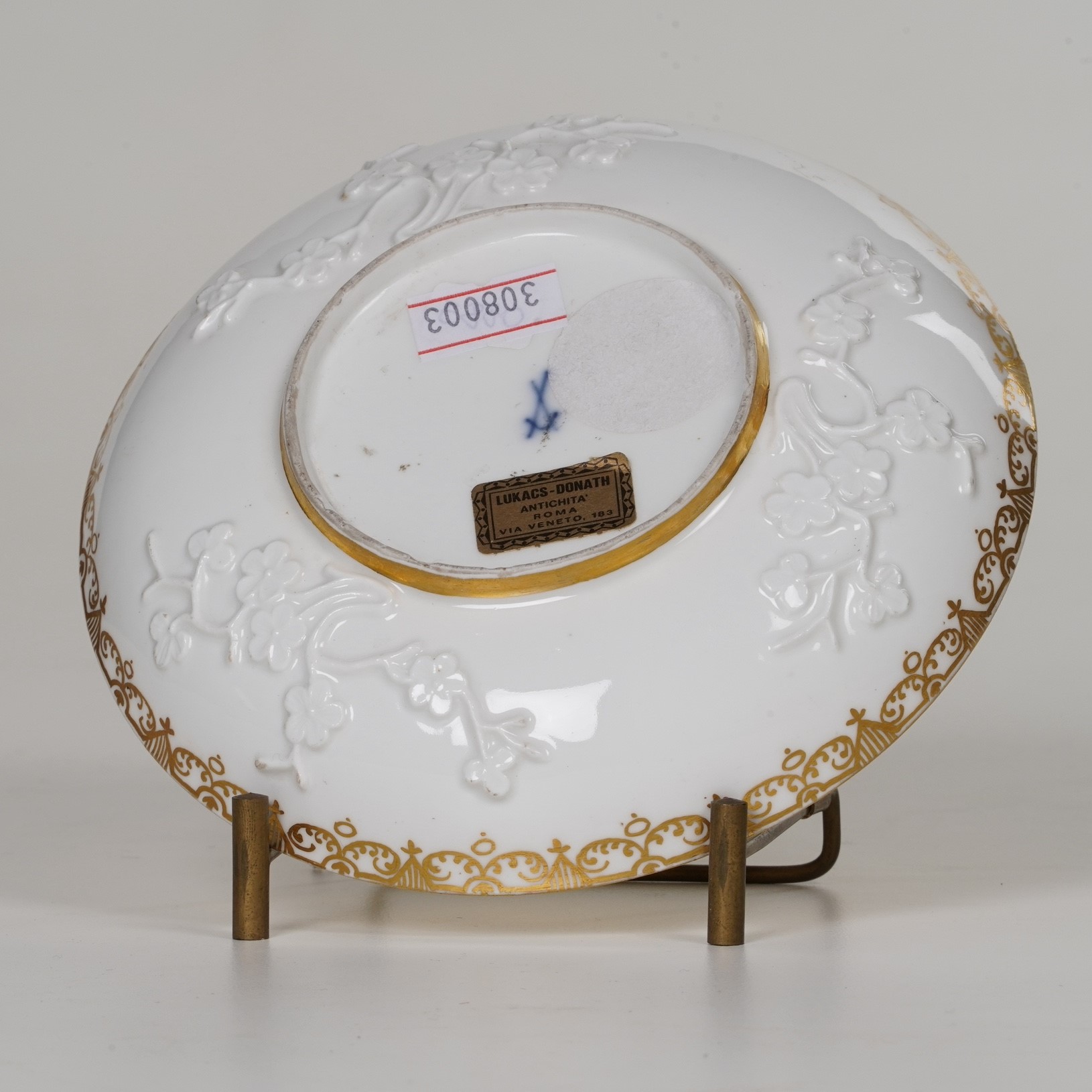 La decorazione vede all’interno della tazza e sul fondo del piattino una riserva, su fondo oro, con scene policrome di commercio marittimo. Al bordo fascia a rocailles dorate