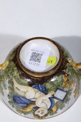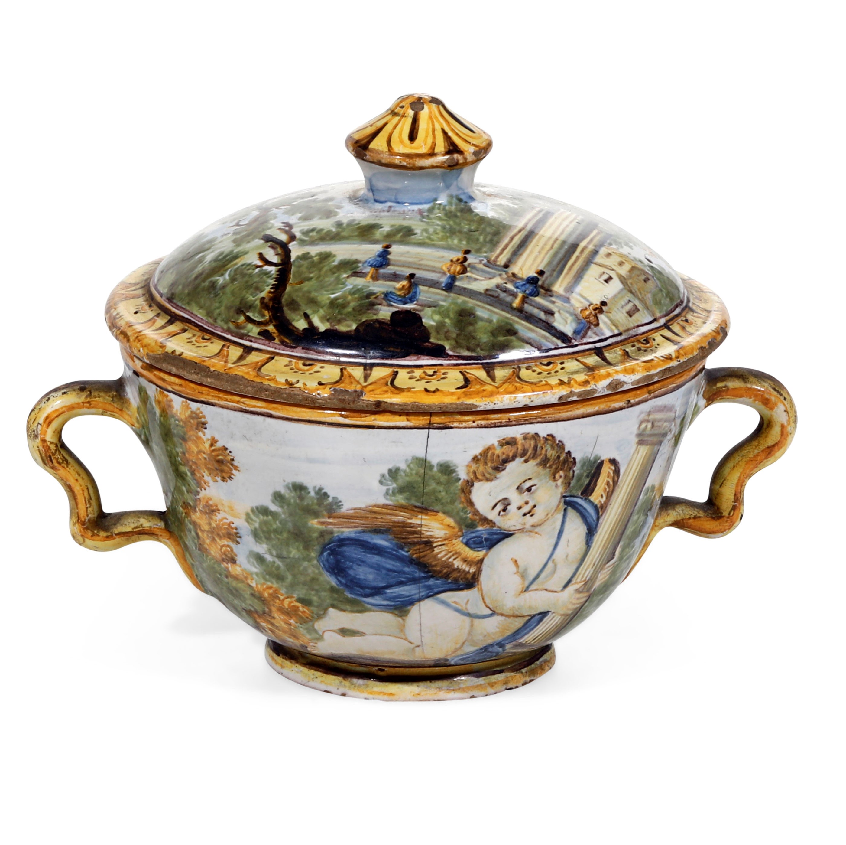 La tazza da brodo biansata, con coperchio dalla presa piriforme, è decorata in policromia a gran fuoco con due putti alati, di cui uno tiene nelle mani una colonna architettonica, l’altro uno specchio o un quadretto. Il resto della superficie è dipinto con un paesaggio alberato senza soluzione di continuità. Il coperchio è abitato da piccoli viandanti tra rovine architettoniche, edifici e vegetazione