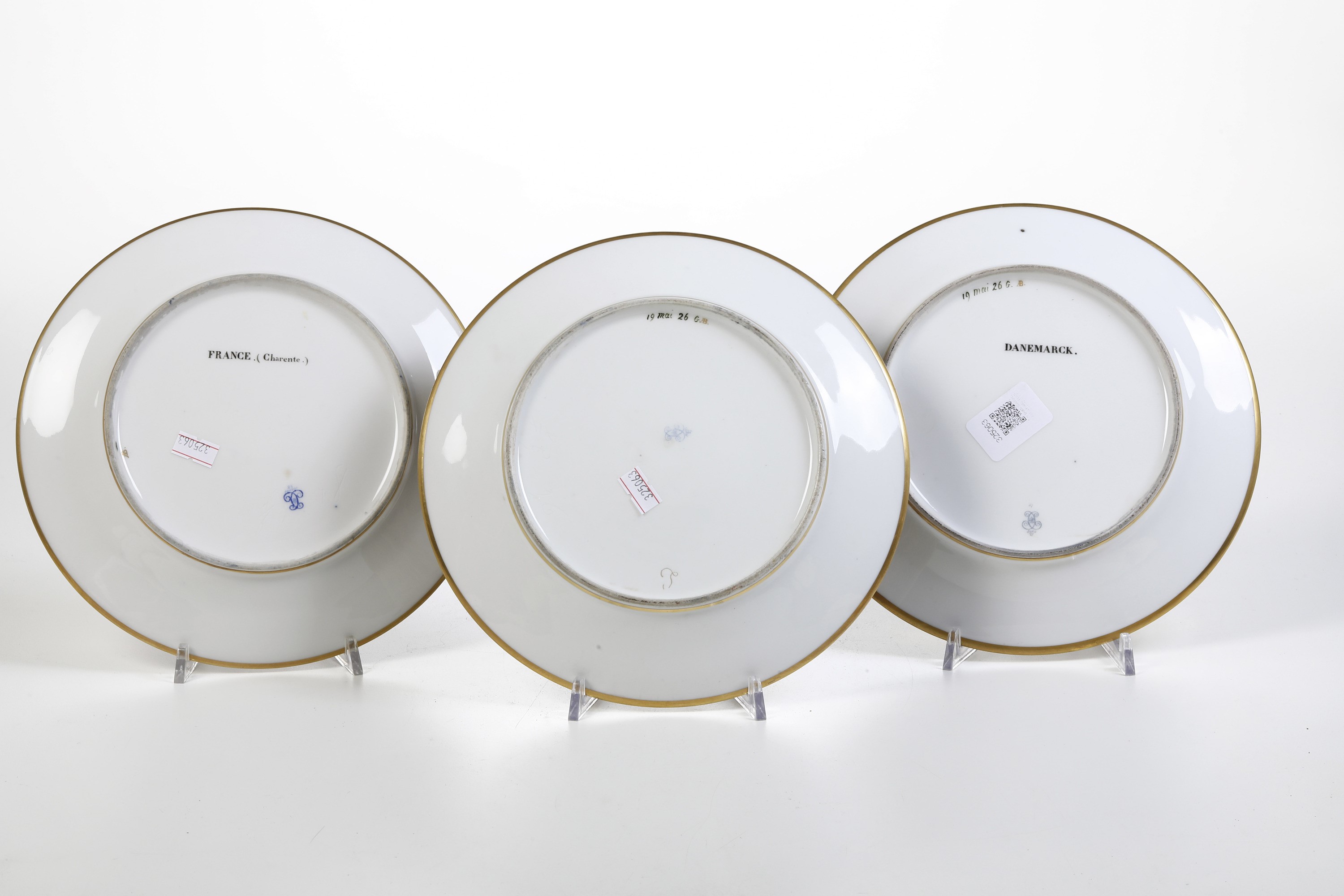 Sul verso di due piatti è menzionato il paesaggio illustrato: il primo a sinistra dell’illustrazione “France (Charente.)”, quello centrale è privo d’iscrizione, il terzo “Danemarck.” Il piatto “Charente” è dipinto con il “Château de la Rochefoucauld.”, come risulta dalla dicitura in oro sul recto, ed è firmato in basso a destra “A.Poupart 1829” (Antoine Achille Poupart attivo a Sèvres dal 1815 al 1848). Il piatto centrale raffigura il “Pont de Martorel et du Mont Serrat.” ed è siglato J.V.M. (per Jaquotot Marie-Victoire 1801-1842), porta la data “19 mai 26”. L’ultimo è dipinto con il “Chateau Royal de Fredriksborg.”, porta la data “19 mai 26”