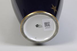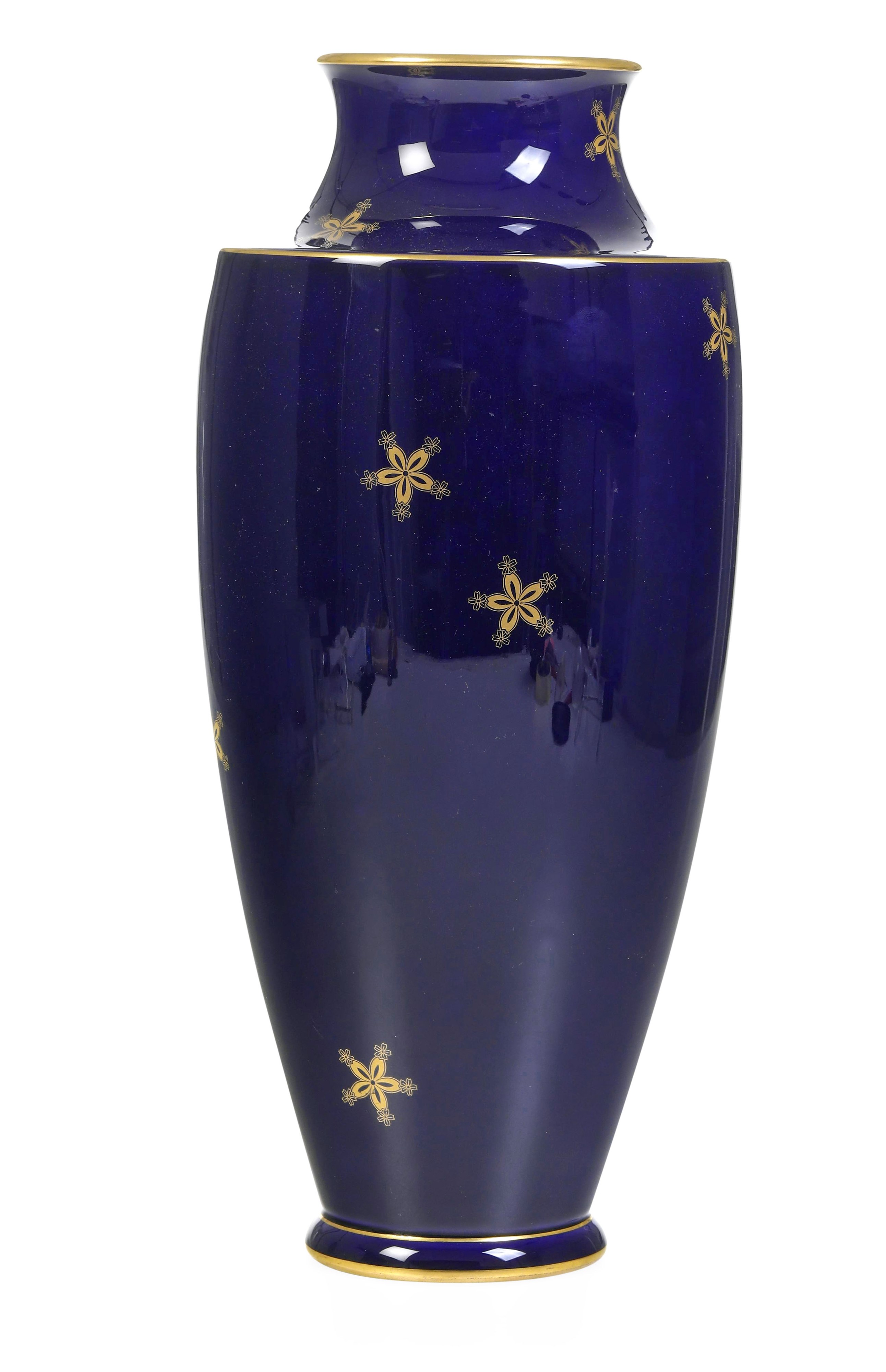 L’elegante vaso a balaustro è decorato con un motivo a piccoli fiocchi di neve stilizzati dipinti in oro su smalto blu cobalto