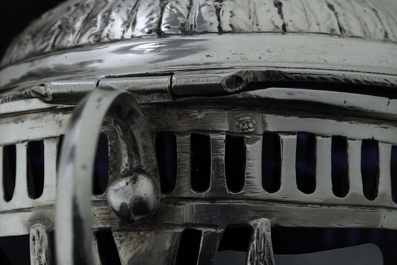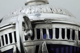 Argento fuso, sagomato e traforato, coppette in vetro blu cobalto