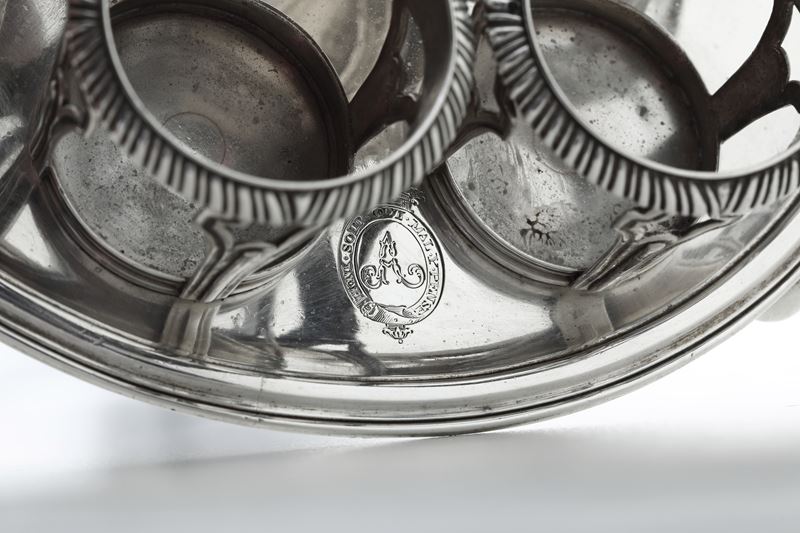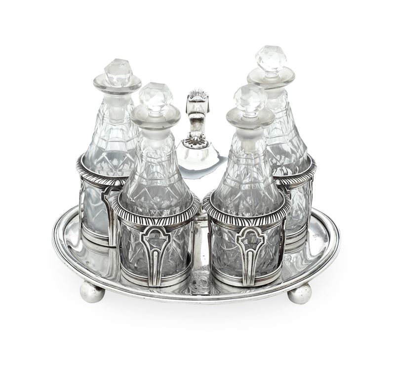Argento fuso, sbalzato, traforato e ampolle in vetro molato