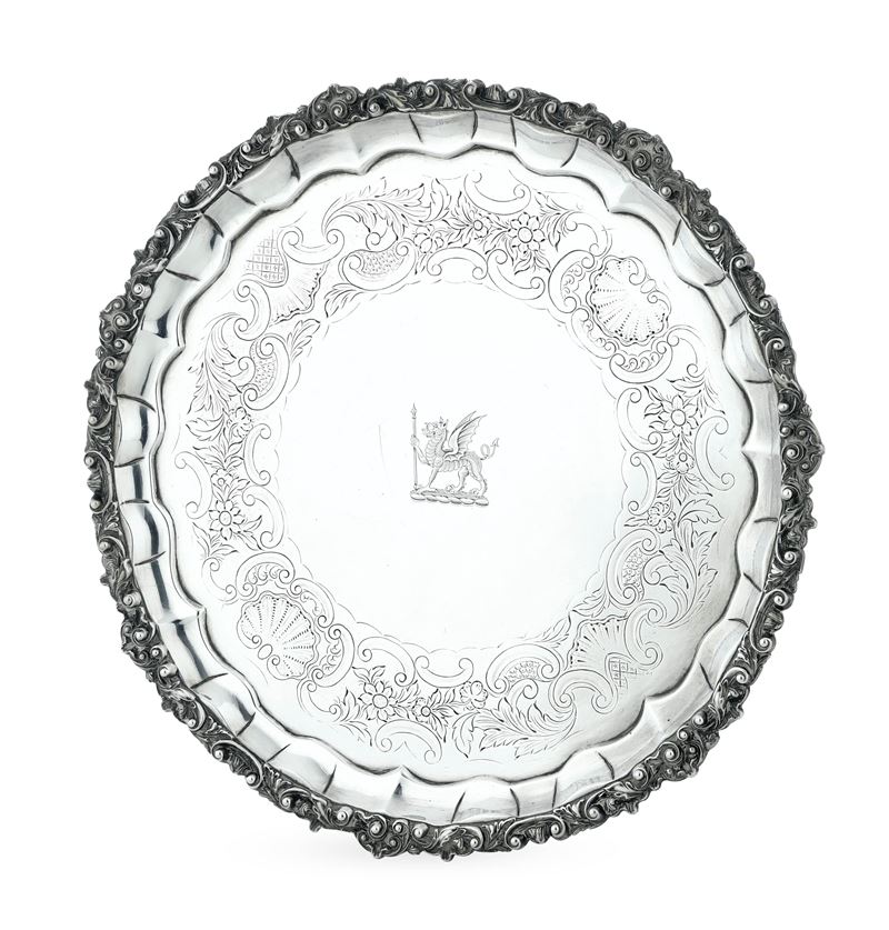 Bordo mistilineo e piatto riccamente ceselalto con crest al centro