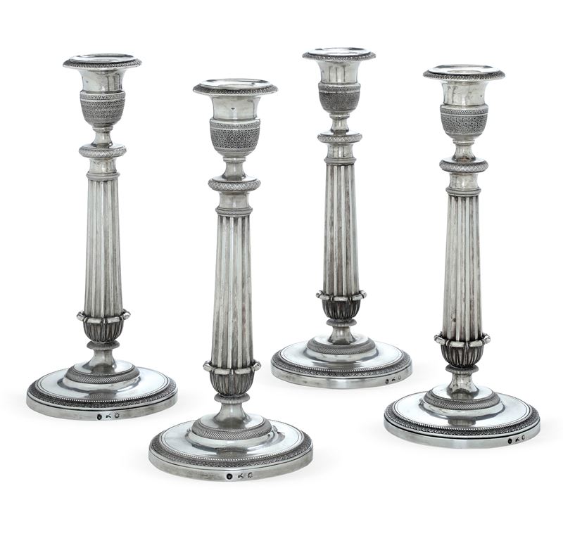 Quattro candelieri. Milano XIX secolo, argentiere Giuseppe Sciomachen