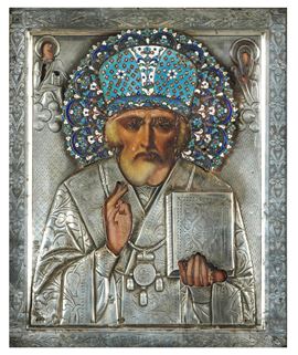 San Nicola il taumaturgo. Riza in argento sbalzato e cesellato. Aureola in smalti policromi cloisonnè