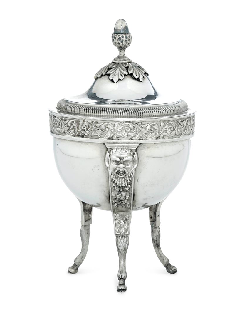 Sostegni a tripode modellati con mascheroni e piedi caprini e coperchio con motivi fogliacei e presa a ghianda