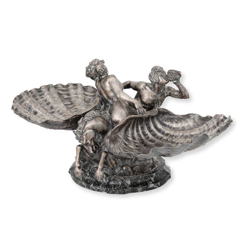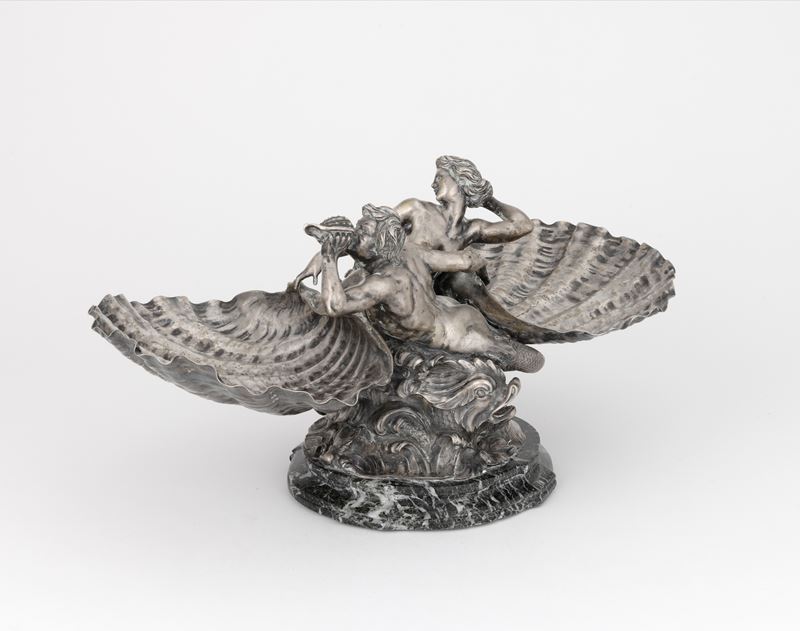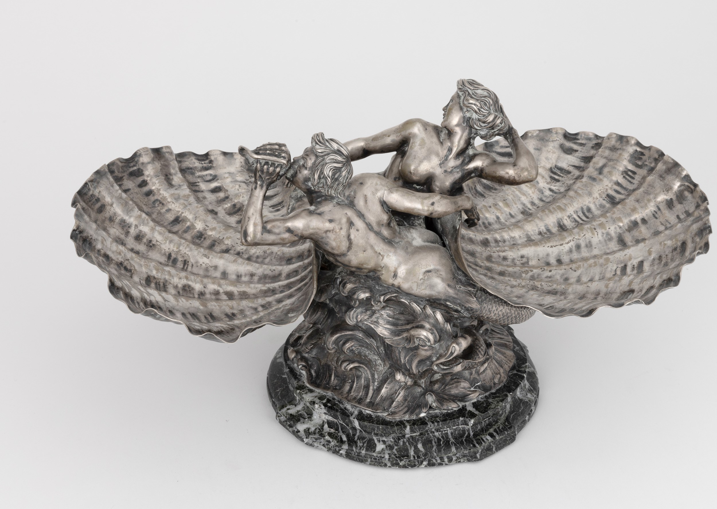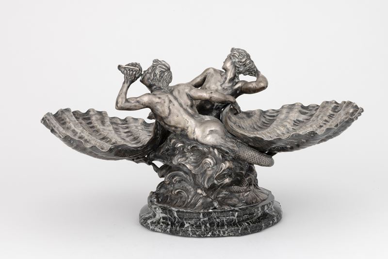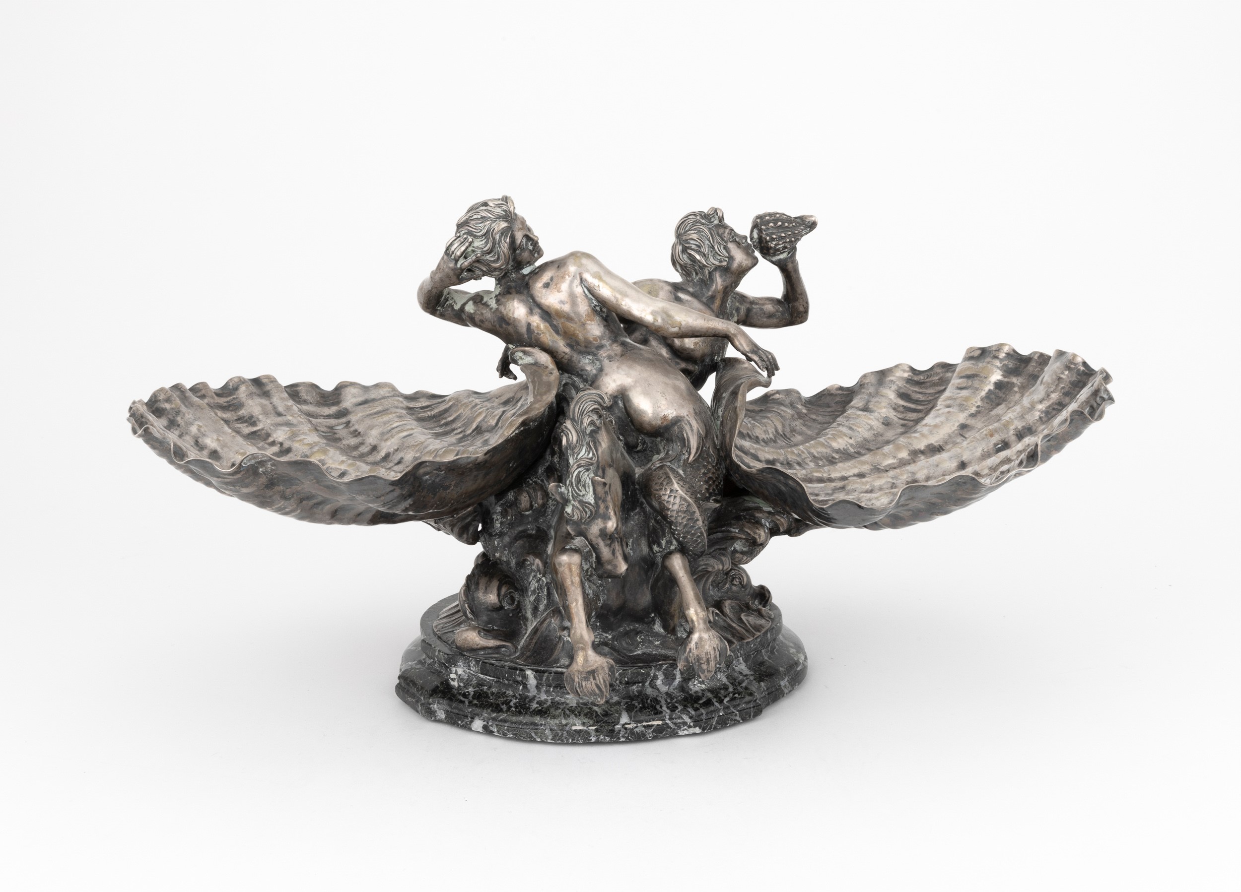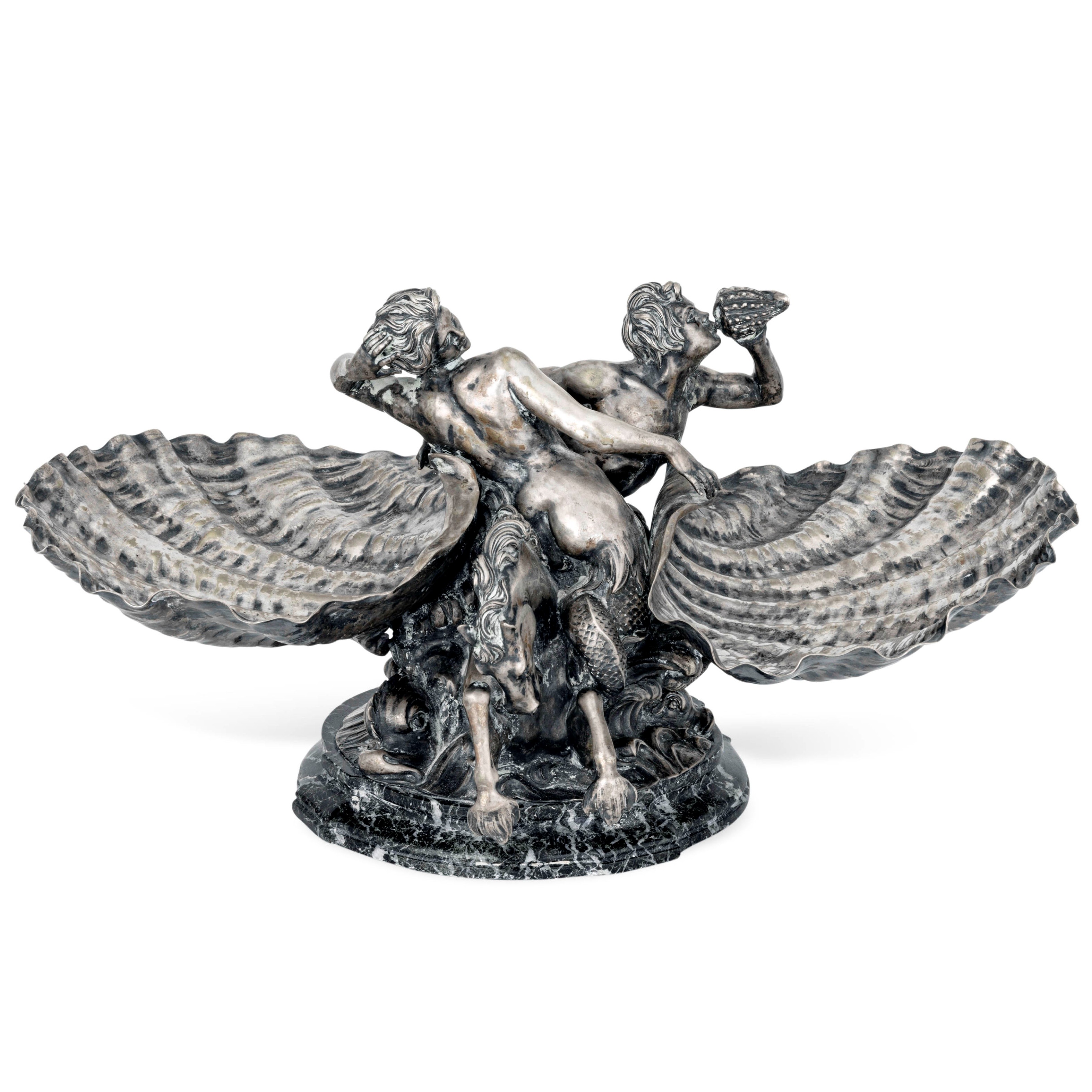 centrotavola a tema marino con tritoni e conchiglie su base modanata in marmo