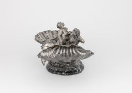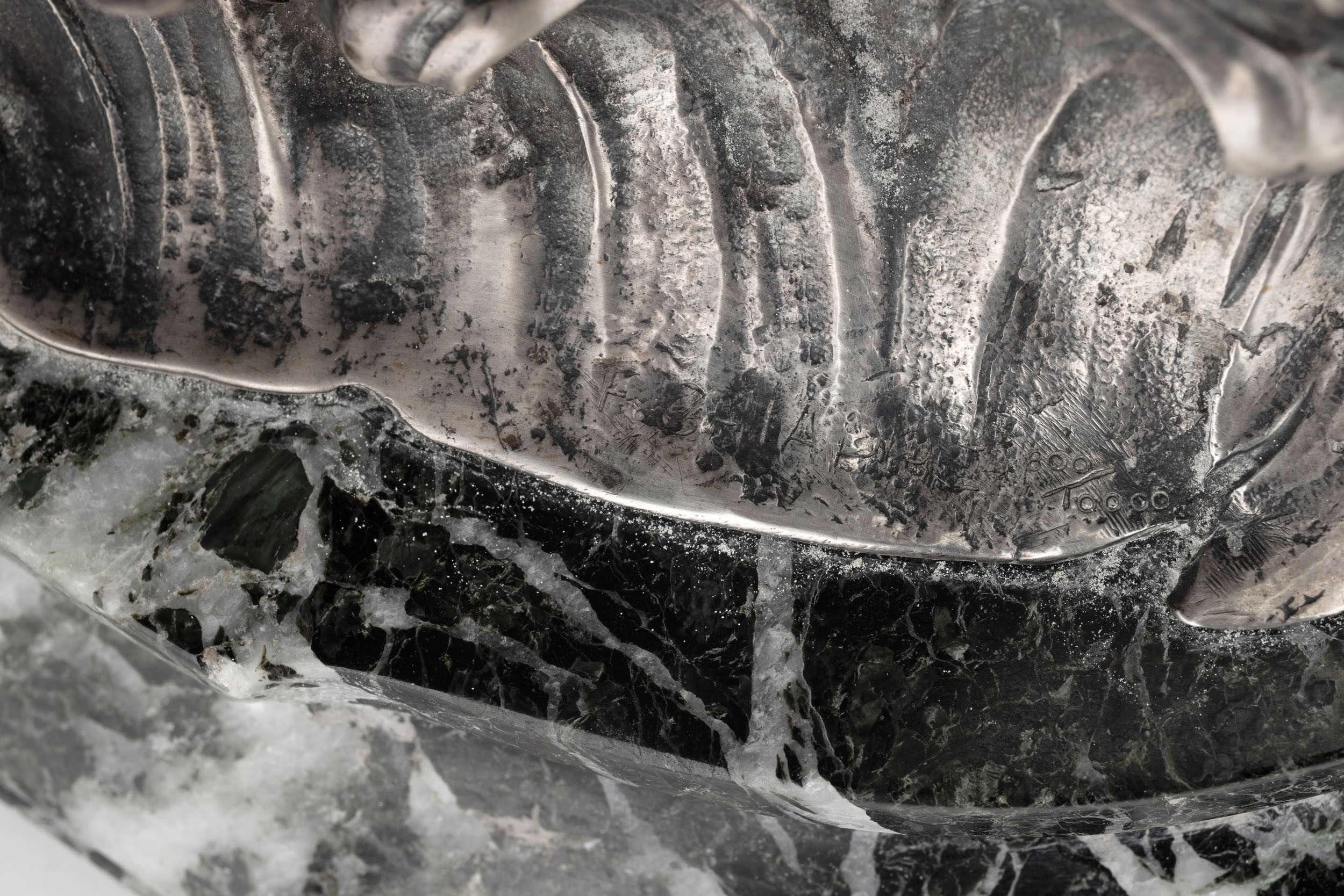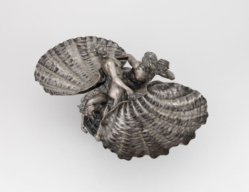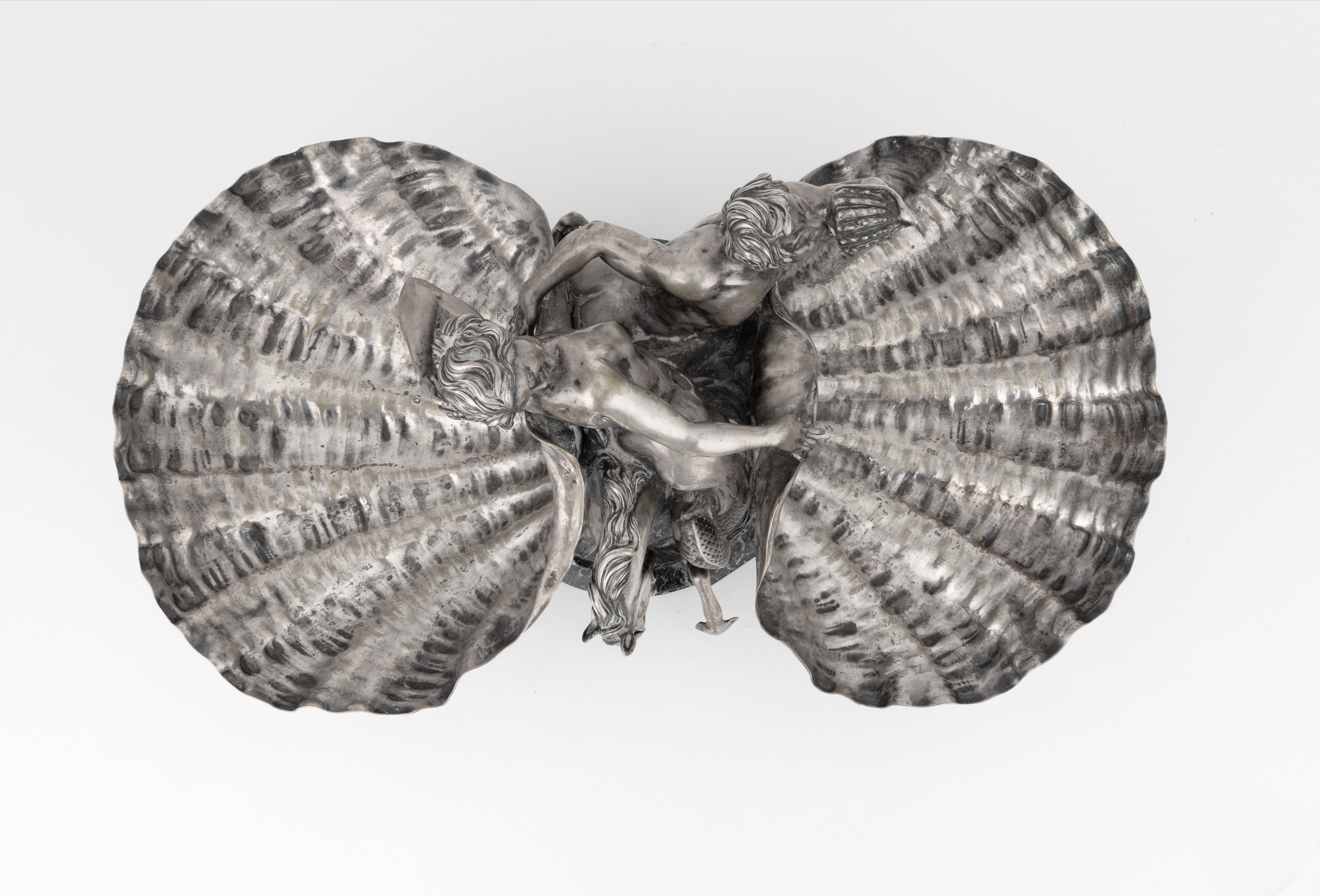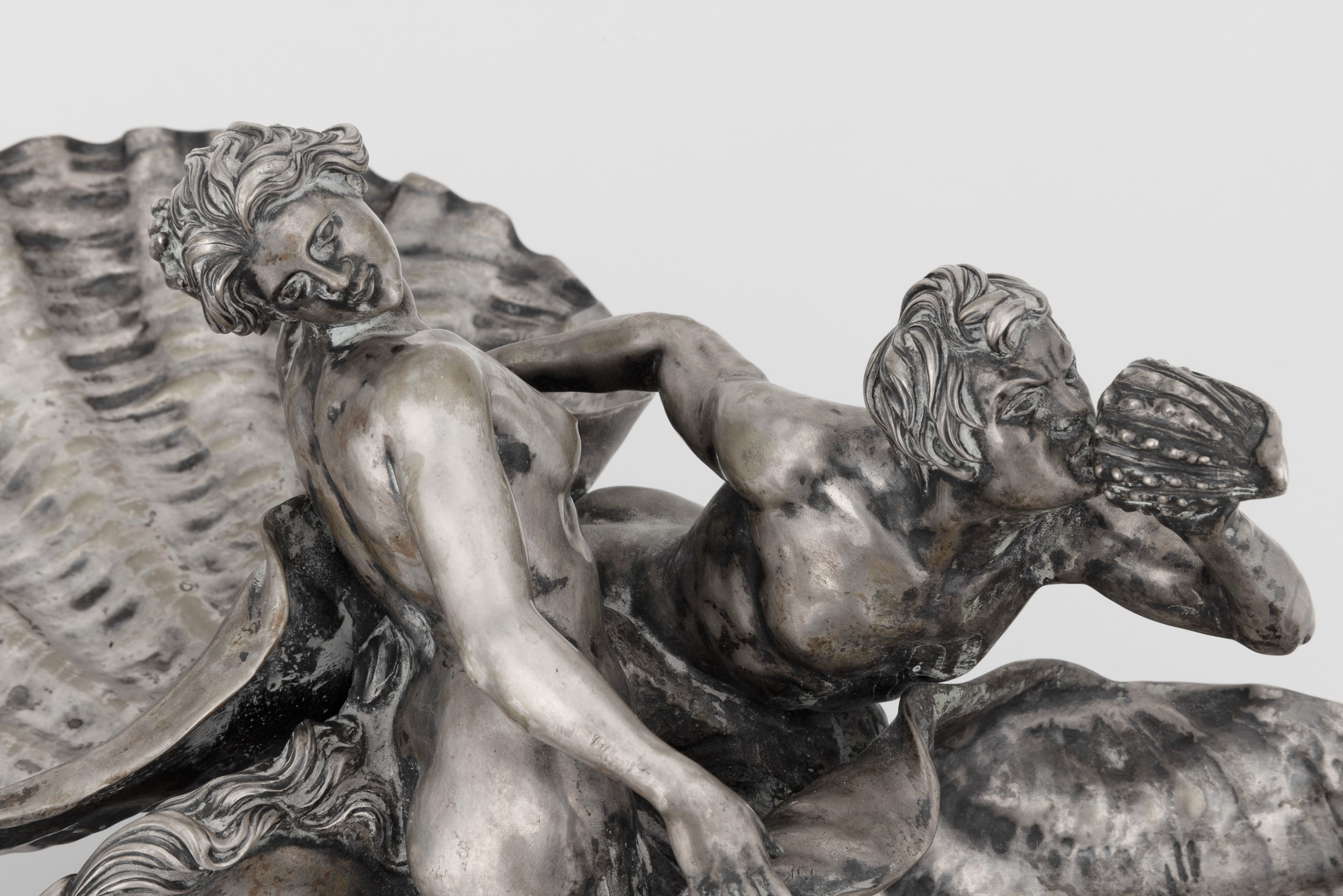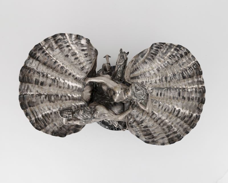 centrotavola a tema marino con tritoni e conchiglie su base modanata in marmo