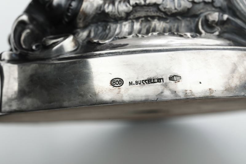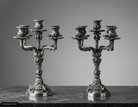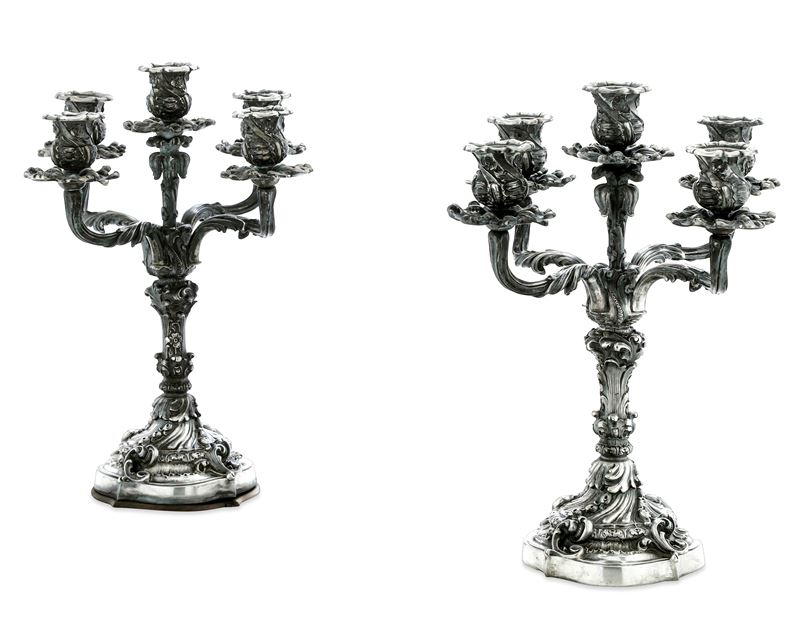 Coppia di candelabri a cinque luci. Maison Mario Buccellati, marchio con fascio littorio in uso adal 1935 al 1945