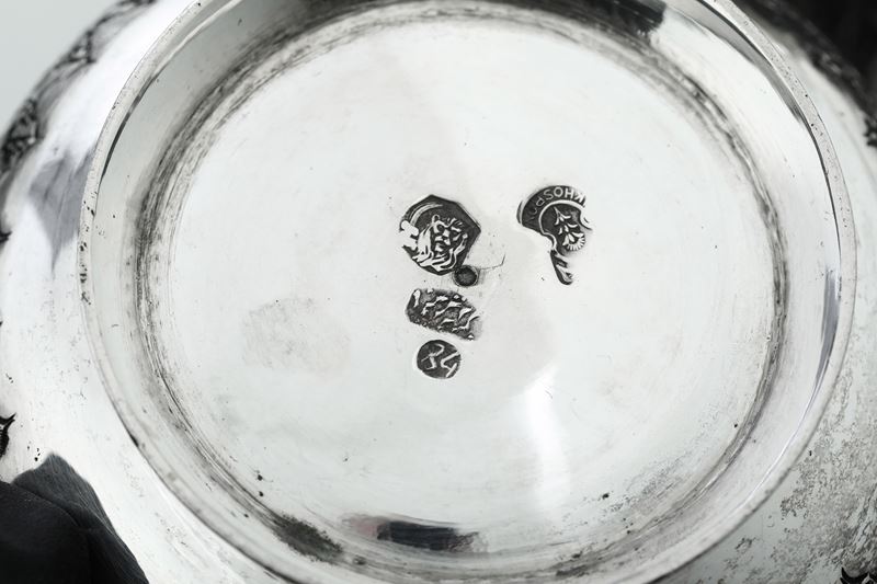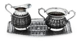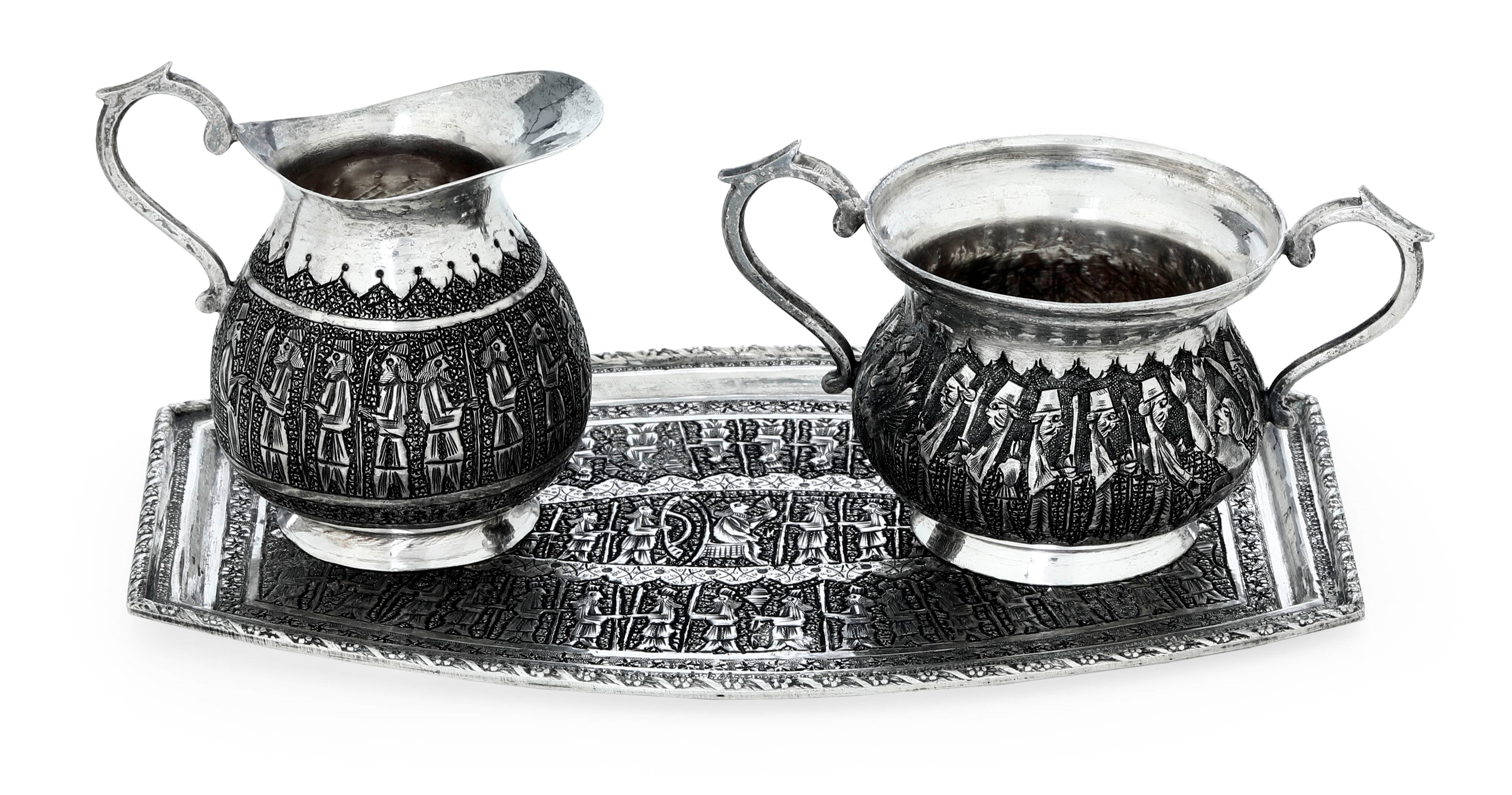 Servizio composto da lattiera e zuccheriera con vassoio. Persia, Era Pahlavi. Marchio Khosrov - Teheran