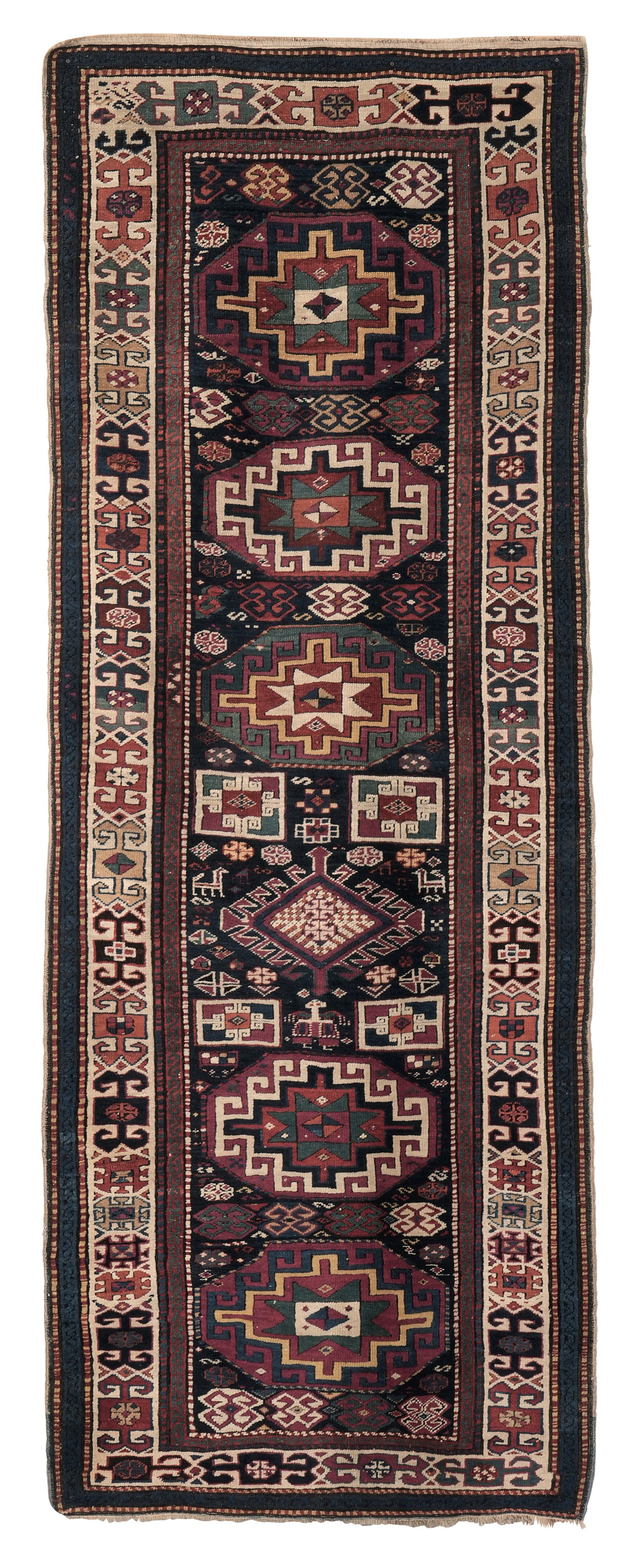 campo blu scuro con medaglioni ottagonali contenenti gul uncinate, bordura bianca