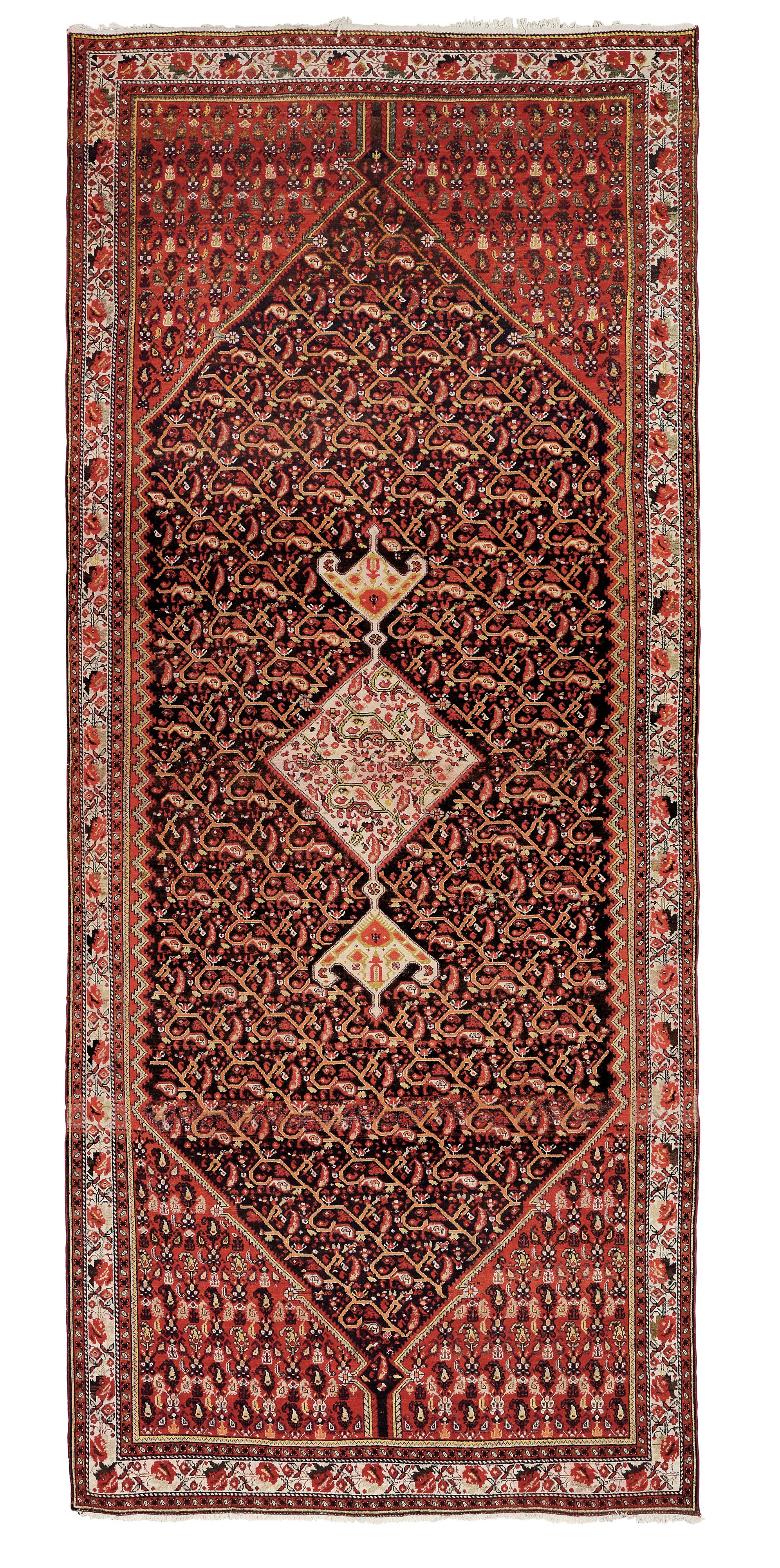 campo rosso con un inusuale decoro su fondo marrone rami in diagonale con bothe, piccolo medaglione centrale con pendenti. Bordura a rose.