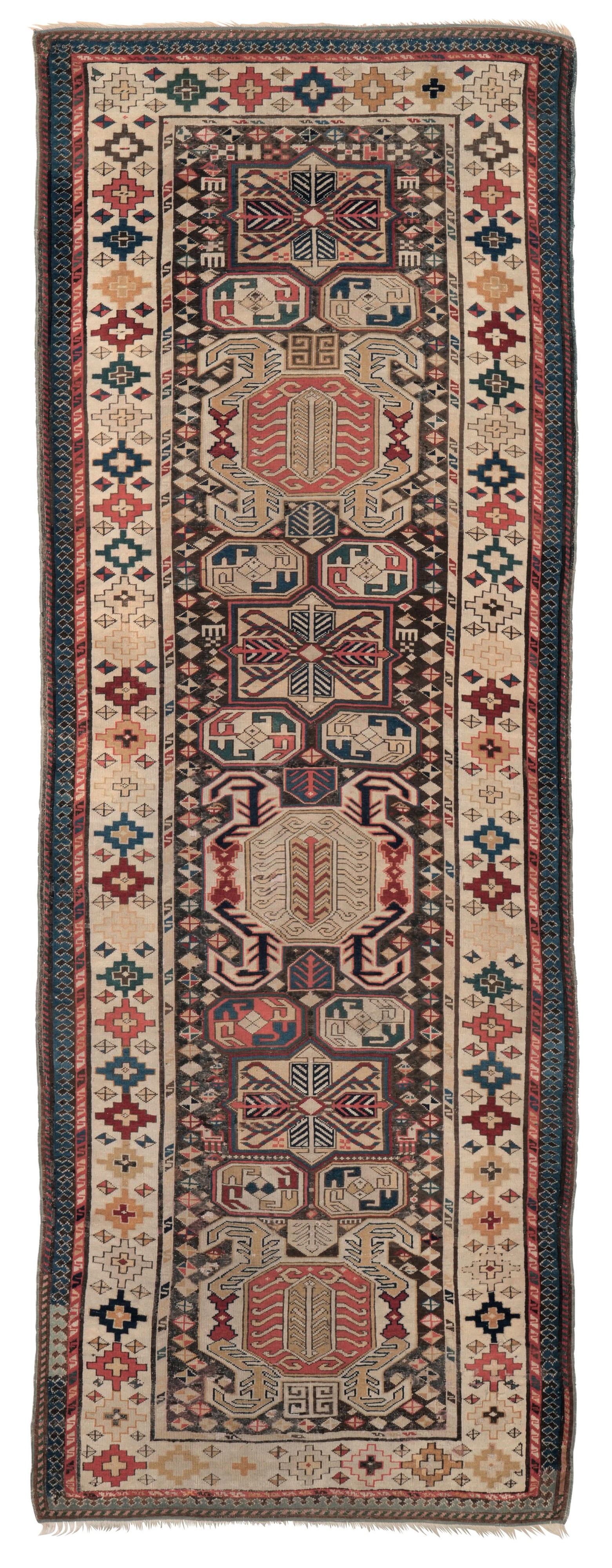 campo blu con medaglioni formati da ottagoni affiancati da motivi ricollegabili ai modelli antichi a draghi. Da notare la presenza di gul di origine turkmena.